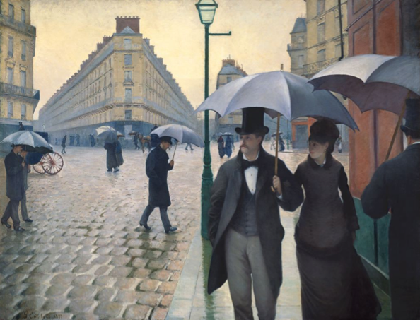 Gustave Caillebotte (French, 1848–1894). Paris Street; Rainy Day, 1877. Oil on canvas; 212.2 x 276.2 cm. The Art Institute of Chicago, Charles H. and Mary F. S. Worcester Collection, 1964.336.