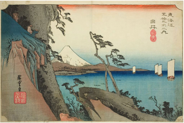 Utagawa Hiroshige (Japanese, 1797–1858). View from Satta Peak, Yui, from the series The Fifty-Three Stations of the Tokaido Road, No. 17 (Tokaido gojusan tsugi no uchi, no. 17), 1833. Color woodblock print; 24.1 x 36.8 cm. The Art Institute of Chicago, Clarence Buckingham Collection, 1925.3518.