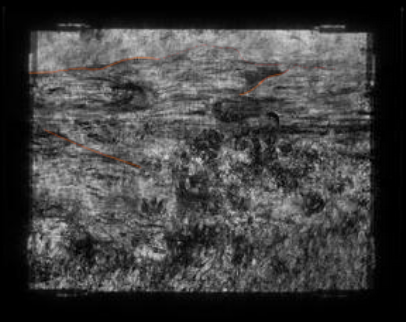Transmitted infrared (Fuji, 1.0–1.1 µm) detail of Monet’s Cliff Walk at Pourville (1882) showing traces of a supplier’s stamp on the verso of the original canvas. The Art Institute of Chicago, 1933.443.