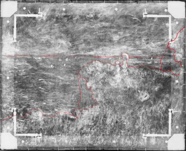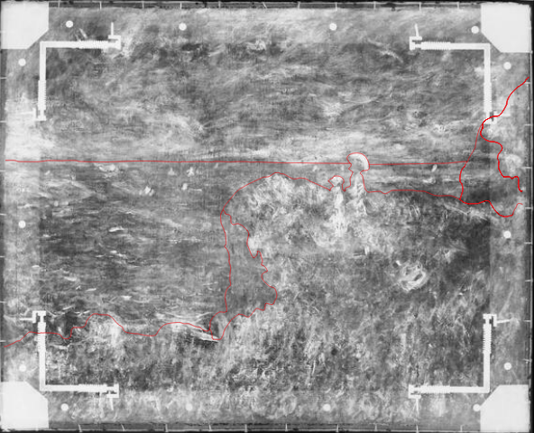 X-radiograph and natural-light image of Monet’s Cliff Walk at Pourville (1882) showing the horizon line in an earlier composition. The Art Institute of Chicago, 1933.443. Interactive image.