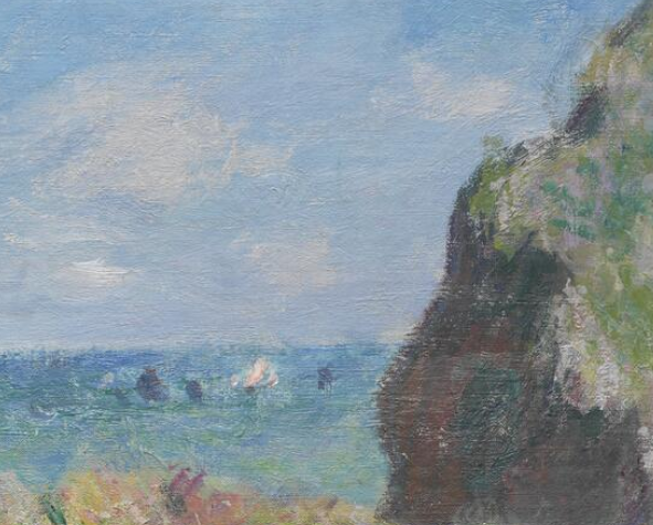 Departing from his home base in Poissy—where he had recently relocated with Alice Hoschedé (the wife of his former patron Ernest Hoschedé, whom he would marry in 1892, after her husband’s death) and their families—Monet visited the coast twice in 1882, from early February to mid-April and from mid-June to early October.74 Because most of the paintings from these trips feature similar subjects and titles, it is often difficult to definitively identify which canvases were produced during each trip.75 The bright summer sky and the inclusion of two female figures—often thought to be Alice and one of her daughters, or perhaps her two eldest daughters, Marthe and Blanche—suggest that Monet executed Cliff Walk during his second trip, when he brought Alice and their combined family with him.76