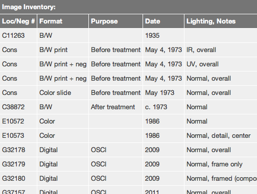 | Conservation | 35mm color slide | During treatment | Nov. 1972 | Normal, detail, partially cleaned (2 slides) |