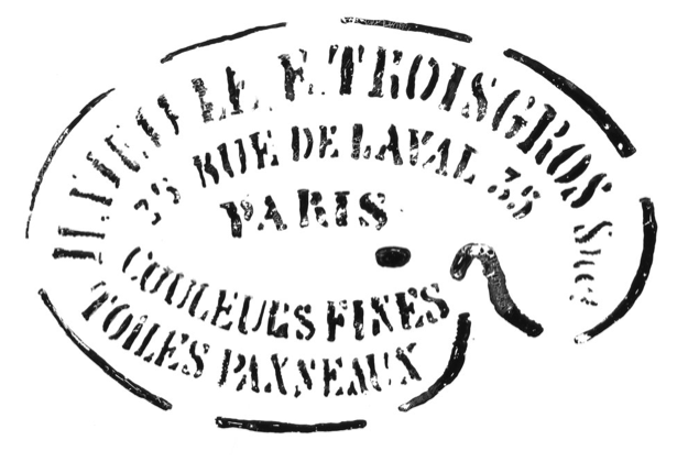There is a supplier’s stamp on the back of the original canvas. Before the painting was lined in 1973 (see Conservation History), a tracing of the stamp was made. The text (not completely legible) is contained within a palette shape: " . . . H. VIEILLE E. TROISGROS … / 35 RUE DE LAVAL 35 / PARIS / COULEURS FINES / TOILES PANNEAUX (fig. 13.21)." The transmitted infrared image shows traces of the stamp, which is located on the mid-left side of the back of the painting (fig. 18.74).
