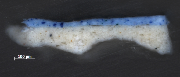 Photomicrograph of the cliff shadow in Monet’s Cliff Walk at Pourville (1882) showing paint from the sky and water that is visible through small areas of paint loss. The Art Institute of Chicago, 1933.443.