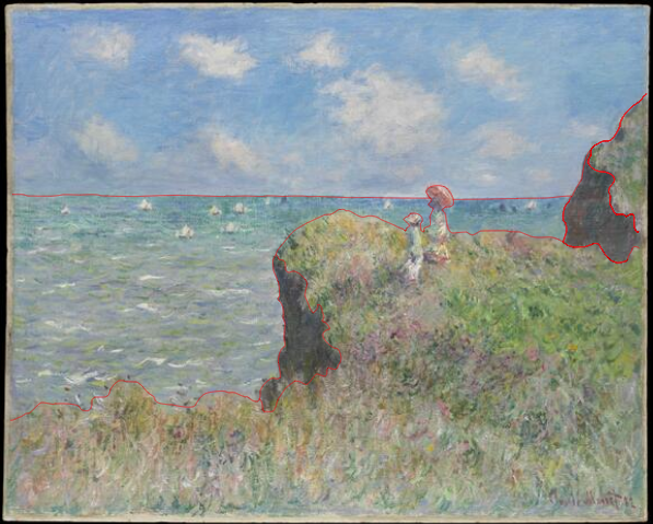 Detail of the cliff edge in Monet’s Cliff Walk at Pourville (1882) showing a change made by the artist. The Art Institute of Chicago, 1933.443.