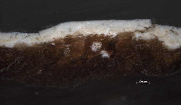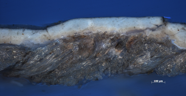 Cross section of the canvas and ground layers of Monet’s Cliff Walk at Pourville (1882). Original magnification: 100x. The Art Institute of Chicago, 1933.443.