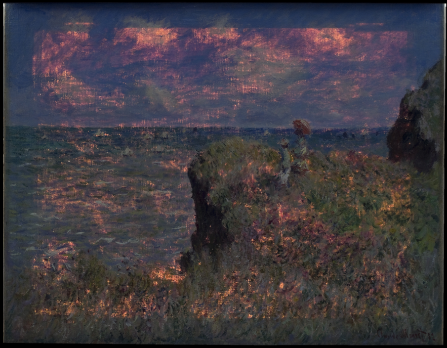 Study of Cliff Walk, Edge of the Cliff, and other “pairs” from 1882 deserves continued attention. However finished the final composition may seem, the Art Institute’s painting reinforces that Monet’s works from Normandy in the early 1880s were part of a developmental phase. Struggling between two worlds, he was on the cusp of abandoning figure paintings for the rest of his career. Though still incorporating human figures in Cliff Walk, he treated them less as modern Parisiennes and more as the abstracted characters from Japanese prints. This tension is manifest not only in the diverse scholarly interpretations the painting has received but also in its physical history.