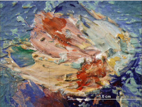 Photomicrograph of the figure’s hat in Monet’s Cliff Walk at Pourville (1882) showing a buildup of brushstrokes. The Art Institute of Chicago, 1933.443.