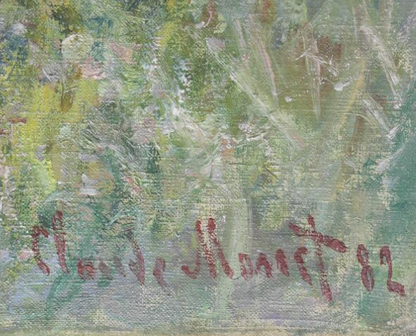 Signed and dated at the lower-right corner, painted (red): Claude Monet 82 (fig. 13.20). Most of the underlying paint was dry when the signature and date were applied, except for a few strokes of pale purplish-gray paint, which were probably added as final touches just before the painting was signed.
