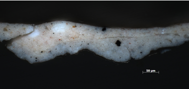 Both ground layers contain the same components: lead white, iron-oxide red, bone or ivory black, silicate minerals, barium sulfate, quartz, and a calcium-based white; however, the relative proportions of these components vary between the two layers, which directly influences their color. The upper pinkish-beige layer contains a higher proportion of iron-oxide red, silicate minerals, and barium sulfate, while the lower gray layer has a slightly higher proportion of bone or ivory black.27