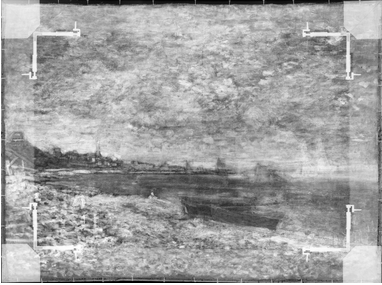 Above the painted-out figures, further out in the water, several forms indicate that the artist experimented with a variety of boats, including some large sailboats and smaller marine craft. In the X-radiograph, two large sails are visible near the horizon (fig. 13.28). Within the area of these large sails, three smaller sails, which seem to have been associated with smaller sailboats, are also visible. All of these forms probably contain a significant amount of lead-white paint, based on their radio-opacity, especially when compared with the dark-sailed fishing boats in the final composition. At the extreme right edge, there appears to be another large sailboat. This is more difficult to discern in the X-radiograph, but it is evident in the infrared reflectogram (fig. 13.29). The artist also seems to have initially included some smaller boats without sails near the horizon and one slightly closer to the shore, which appears to carry two passengers. Moving left along the horizon, two more small sails are visible just to the right of the fishing boat from the final painting. On the left side of the fishing boat, among the smokestacks on the distant shore, it appears that the artist originally included a triangular flag (fig. 13.30) and, subsequently, more billowing smoke from the chimneys (fig. 13.31), which was then cursorily obscured with a few strokes of grayish paint (fig. 13.32). Passages of more solid and slightly “mismatched” paint along the horizon seem to represent areas where the artist worked to cover over the earlier compositional elements. The small vessels were applied wet-on-wet over the blue-gray paint along the horizon (fig. 13.33).