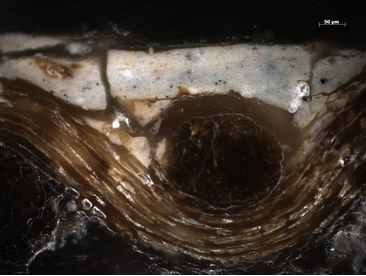 Observing the painting microscopically, only the upper ground layer is visible. It has a warm pinkish-beige tone, which can be seen in small areas throughout the painting at breaks in the brushwork (fig. 13.17). Cross-section analysis shows another layer below the pinkish-beige one that is light gray in color (fig. 13.18).
