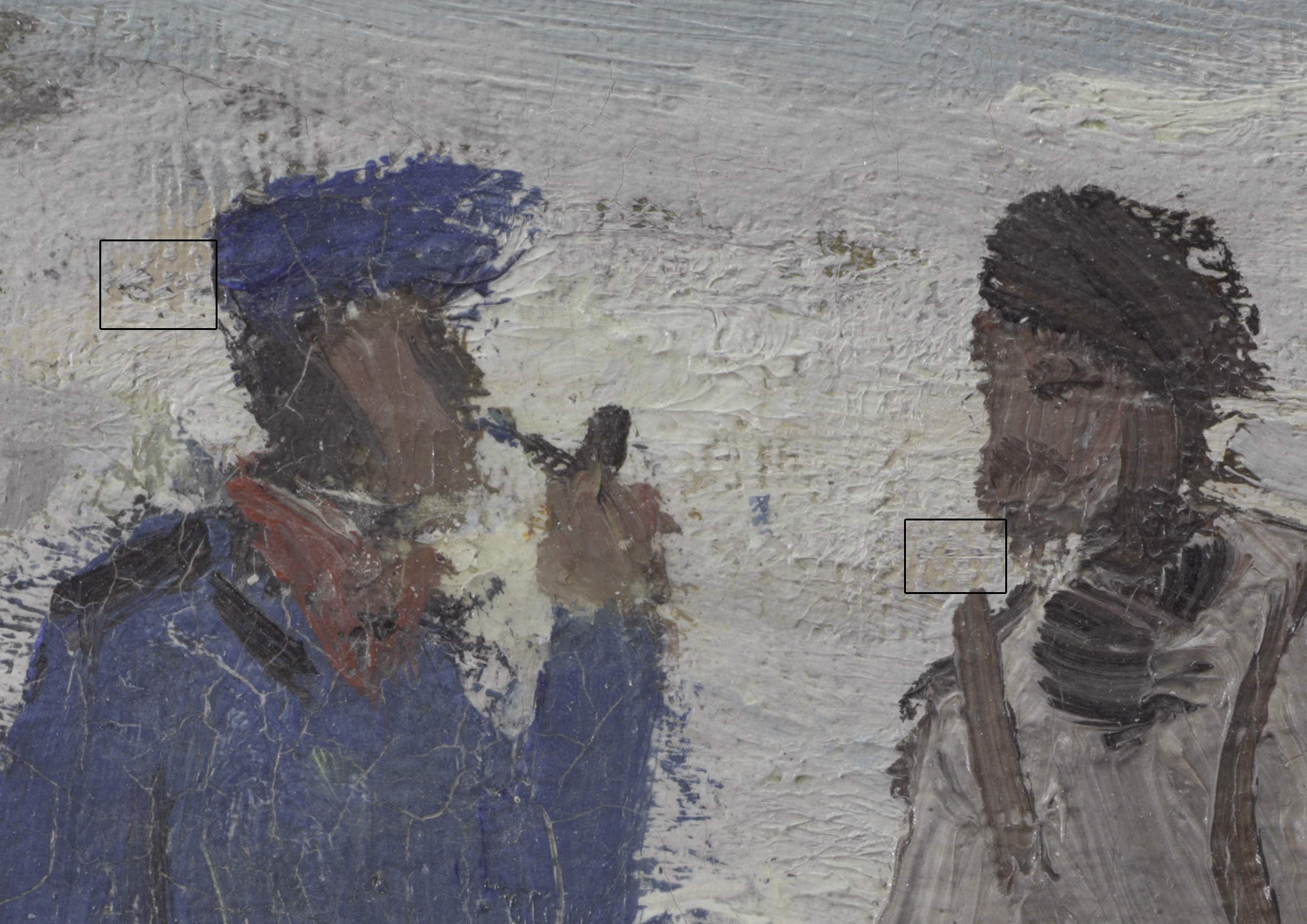 No underdrawing was detected with infrared reflectography (IRR); however, some black particulate material was observed microscopically in a few localized areas. To the left of the heads of the left and middle fishermen, there are a few concentrated areas of black particles deposited on the high points of the primed canvas between the ground and paint layers (fig. 13.19 and fig. 13.20). At the extreme left edge, directly above the boats, are three short lines at varying angles (fig. 13.21), where the black particles appear to be on top of or incorporated into the paint layer (fig. 13.22).