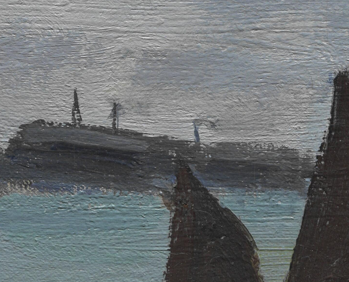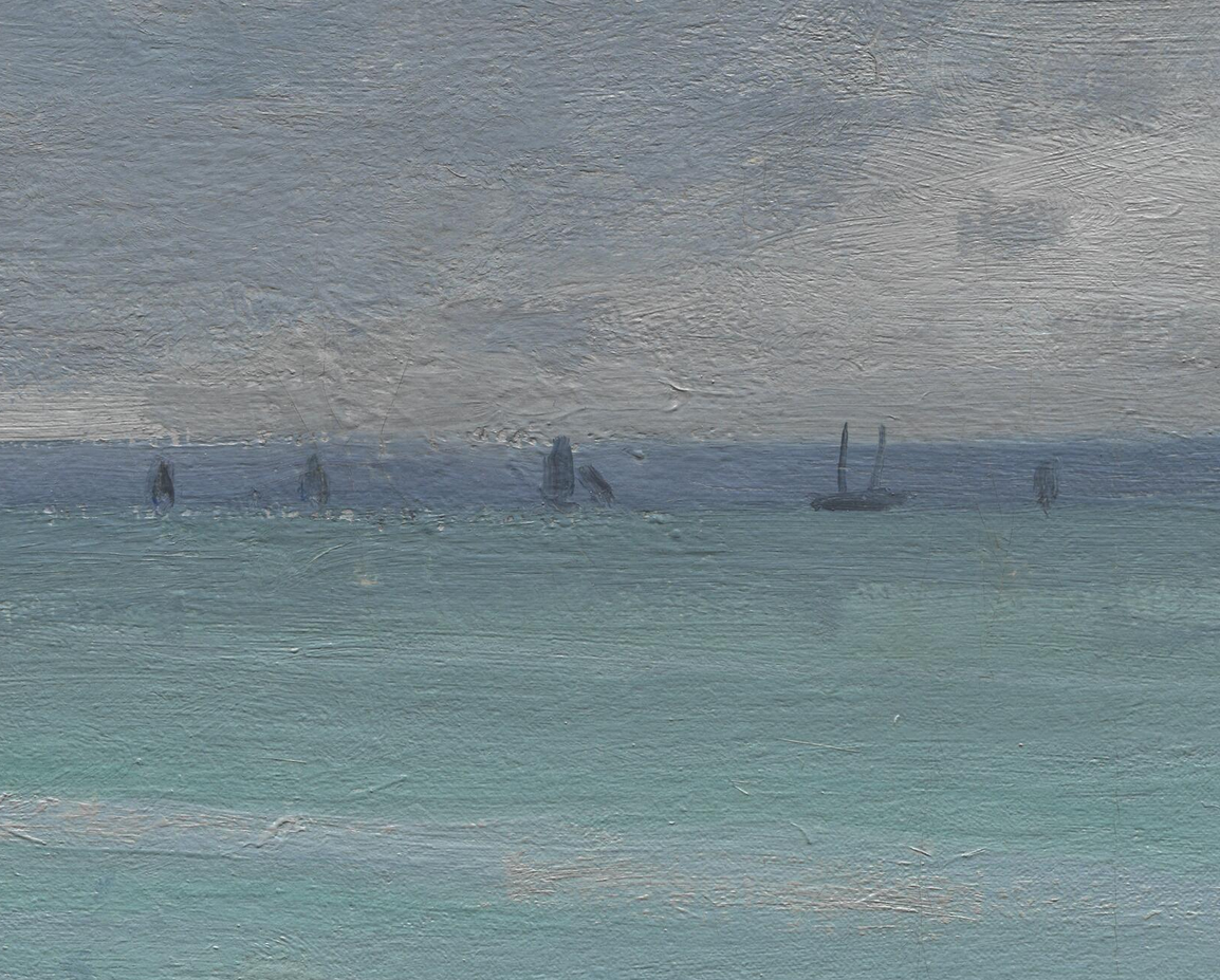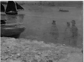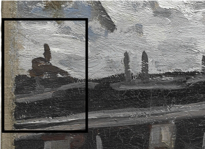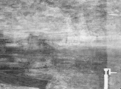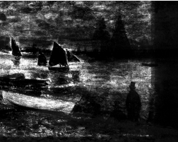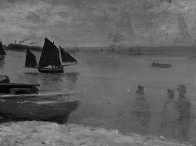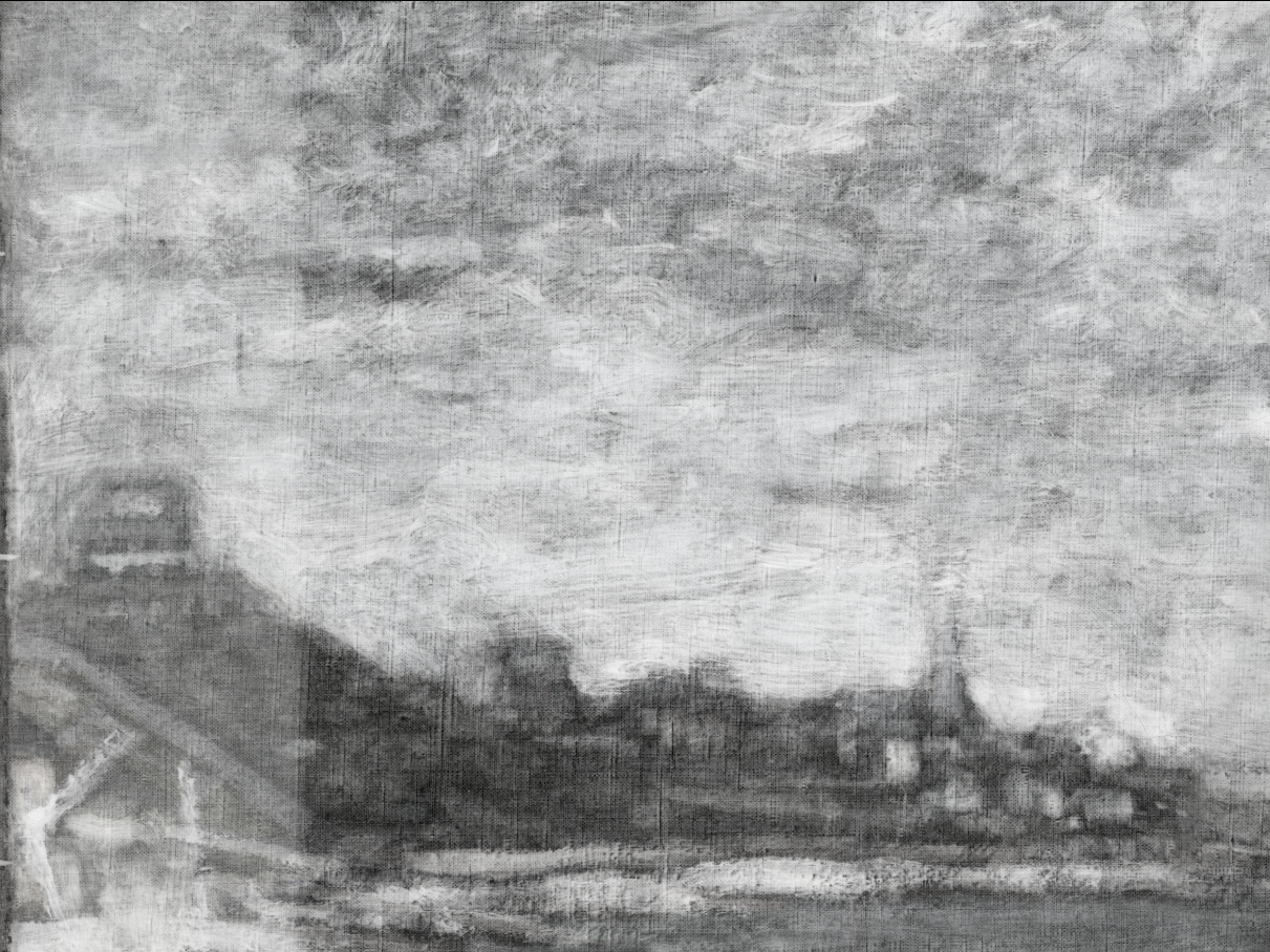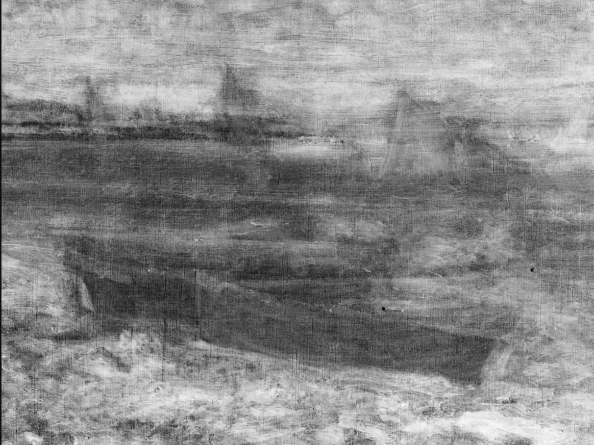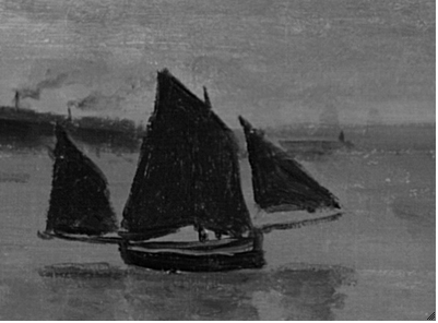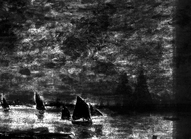 Above the painted-out figures, farther out in the water, several forms indicate that the artist experimented with a variety of boats, including some large sailboats and smaller marine craft. In the X-ray, two large sails are visible near the horizon (fig. 13.27). Within the area of these large sails, three smaller sails, which seem to have been associated with smaller sailboats, are also visible. All of these forms probably contain a significant amount of lead white paint, based on their radio-opacity, especially when compared with the dark-sailed fishing boats in the final composition. At the extreme right edge, there appears to be another large sailboat. This is more difficult to discern in the X-ray, but it is evident in the infrared reflectogram (fig. 13.28). The artist also seems to have initially included some smaller boats without sails near the horizon and one slightly closer to the shore, which appears to carry two passengers. Moving left along the horizon, two more small sails are visible just to the right of the fishing boat from the final painting. On the left side of the fishing boat, among the smokestacks on the distant shore, it appears that the artist originally included a triangular flag (fig. 13.29) and, subsequently, more billowing smoke from the chimneys (fig. 13.30), which was then cursorily obscured with a few strokes of grayish paint (fig. 13.31). Passages of more-solid and slightly “mismatched” paint along the horizon seem to represent areas where the artist worked to cover over the earlier compositional elements. The small vessels were applied [glossary:wet-on-wet] over the blue-gray paint along the horizon (fig. 13.32).