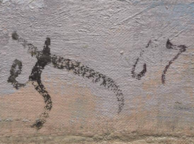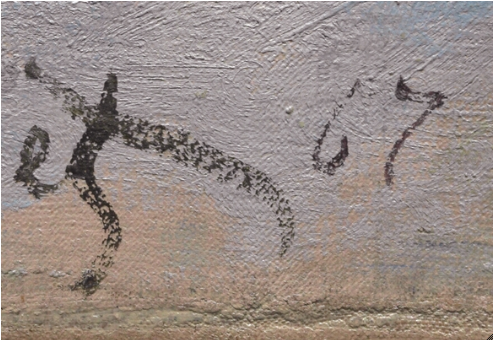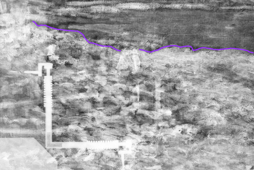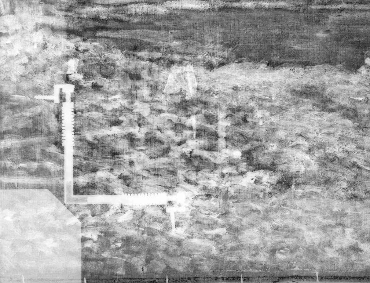 Possible underdrawing in the area of the fishermen’s heads could have formed part of an earlier outline of the beach, which appears to have been extended farther into the water in this area during painting (see Application/technique and artist’s revision). It is unclear what the marks at the left edge are related to.