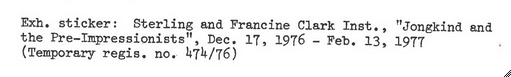 Northampton, Mass., Smith College Museum of Art, Jongkind and the Pre-Impressionists: Painters of the Ecole Saint-Siméon, Oct. 15–Dec. 5, 1976, cat. 90 (ill.); Williamstown, Mass., Sterling and Francine Clark Art Institute, Dec. 17, 1976–Feb. 13, 1977.