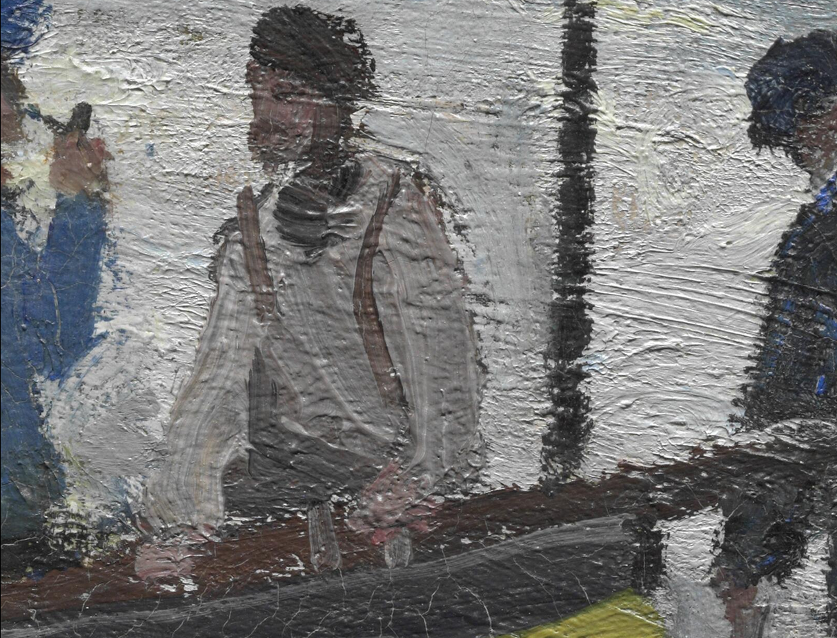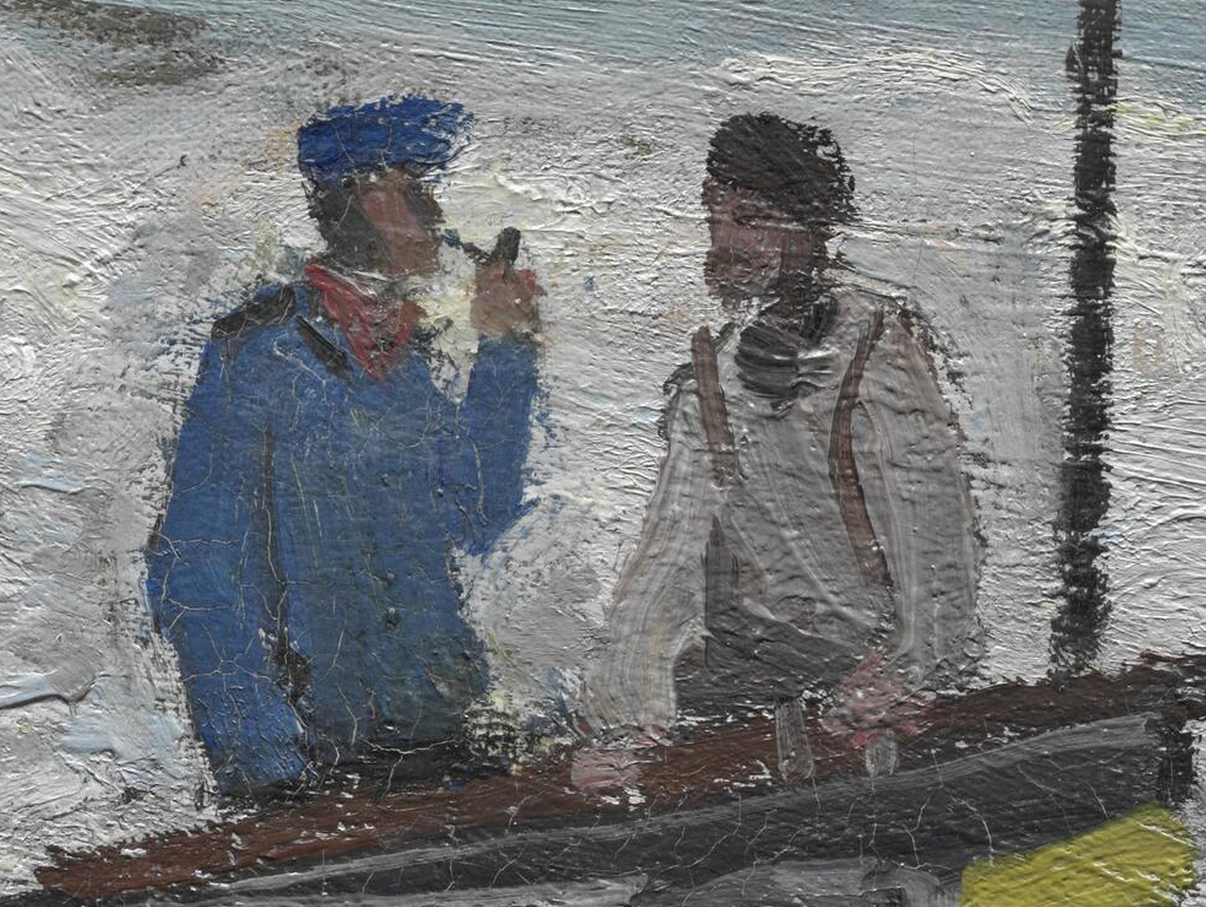 Detail of fishermen in Monet’s The Beach at Sainte-Adresse (1867) showing the locations of possible underdrawing material. The Art Institute of Chicago, 1933.439.