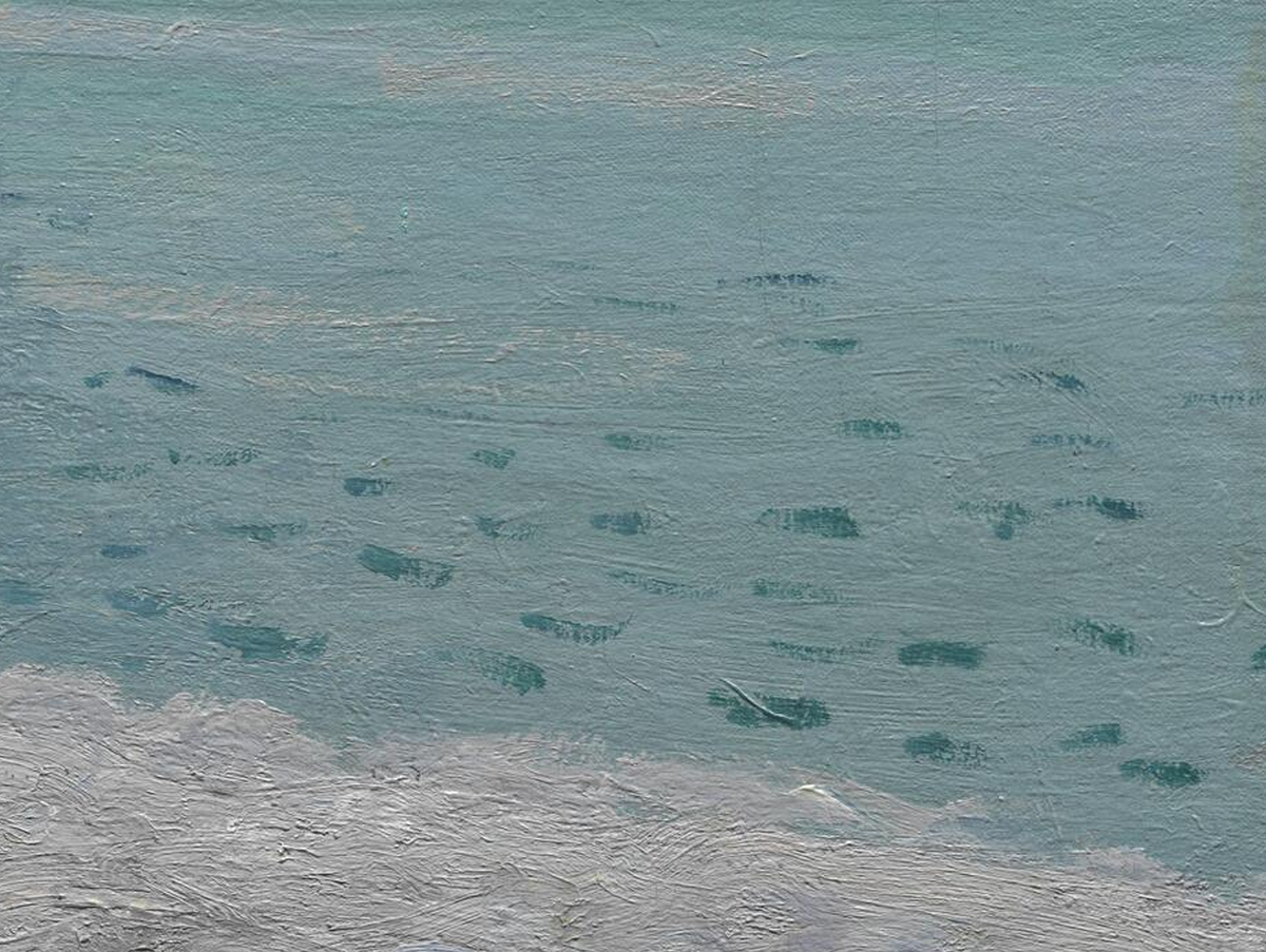 Detail of the water in Monet’s The Beach at Sainte-Adresse (1867) showing brushstrokes that skip across the surface of the underlying paint texture. The Art Institute of Chicago, 1933.439.