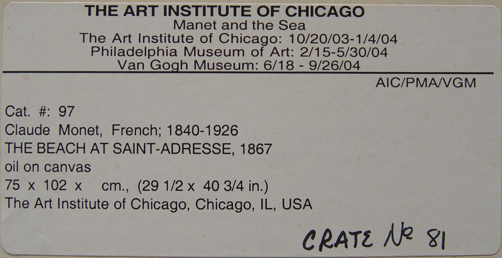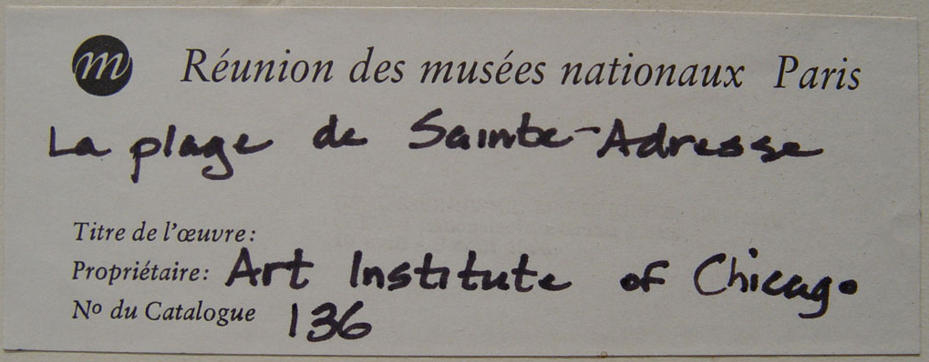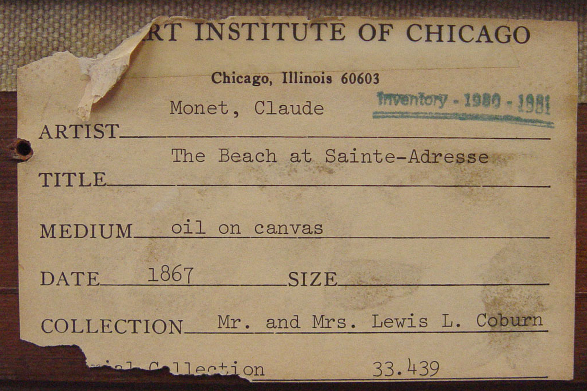 Monet’s The Beach at Sainte-Adresse (1867) in a previous frame (installed after Nov. 1, 1933). The Art Institute of Chicago, 1933.439.