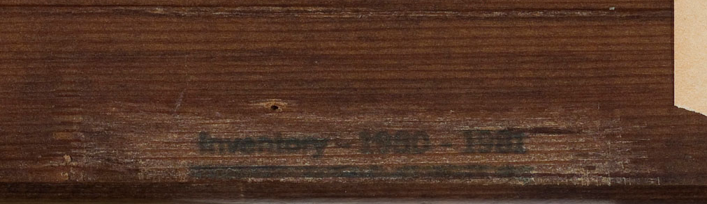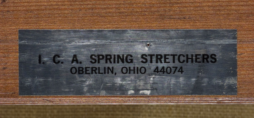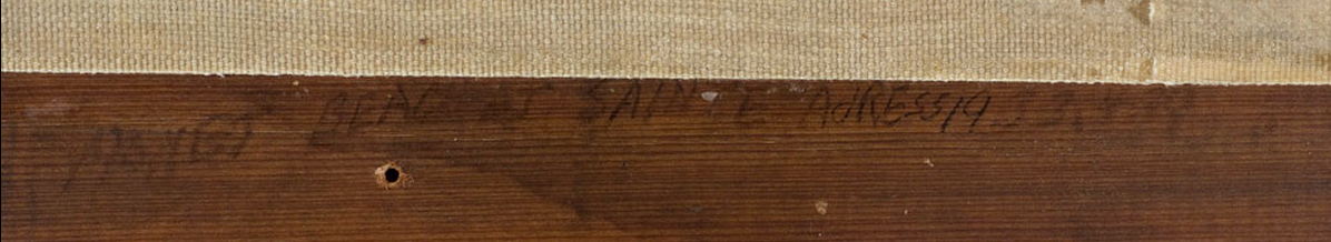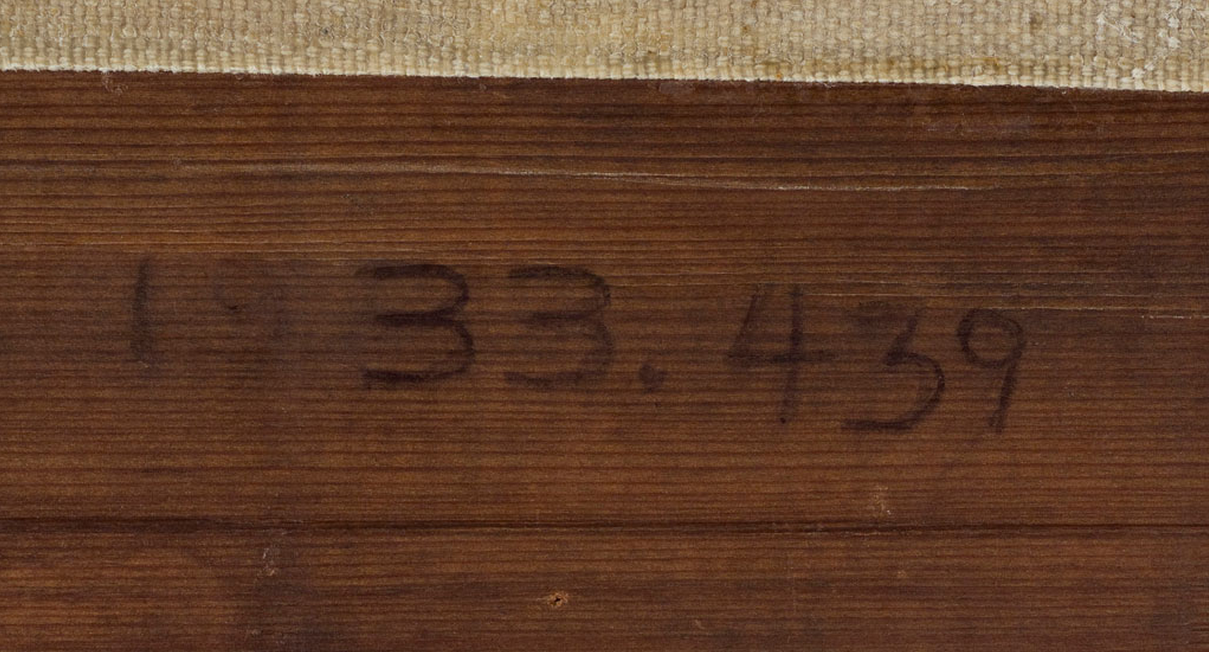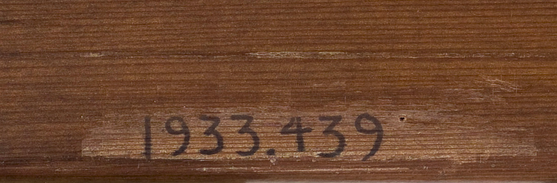 Original stretcher: The 1973 treatment report notes that the previous [glossary:stretcher] was a “6-piece stretcher with crosspiece” (see Conservation History). Since the painting was lined with an aqueous adhesive at an unknown date prior to 1957, it is uncertain whether the stretcher mentioned in the 1973 report was the original or whether it dated to the aqueous lining. But vertical [glossary:stretcher-bar cracks] near the center of the painting suggest that the original stretcher was five membered, with a vertical [glossary:crossbar] only. The original stretcher depth is unknown.
