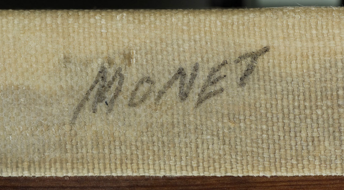 Detail of the signature in Monet’s The Beach at Sainte-Adresse (1867) showing the different colors of paint used for it and the date. The Art Institute of Chicago, 1933.439.