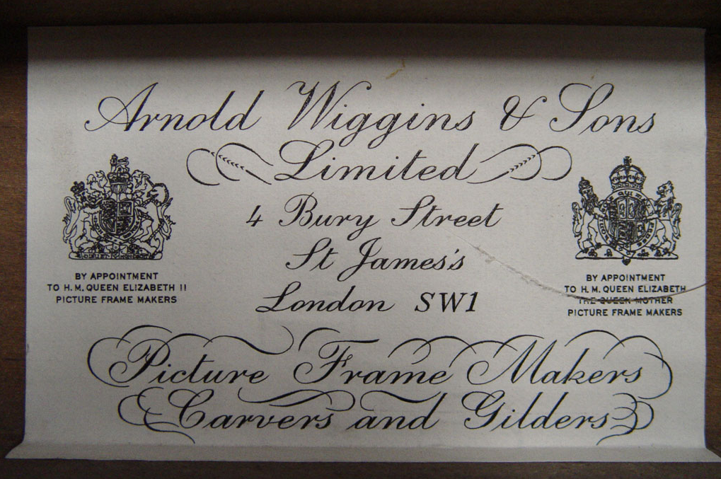 Current frame (1999): The frame is not original to the painting. It is an English (Arnold Wiggins & Sons, London, 1999), Louis XVI Revival, gilt, scotia frame with egg-and-dart ornament, a stepped and beaded frieze, and a beveled sight. The wood is jelutong with compo ornament. The construction is mitered and nailed. The finish is water gilding over red-orange bole on gesso. The egg-and-dart ornament, the fillet, and the inner cove are burnished; the scotia side and the face and sight fillet and bevel are unburnished. The toning is with casein and oil (estimated). The molding, from perimeter to interior, is ribbon-and-reel compo outer molding; scotia side; stepped fillet; egg-and-dart compo molding; scotia; fillet with beaded compo ornament; cove; fillet; and beveled sight molding (fig. 13.51).40
