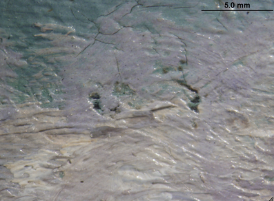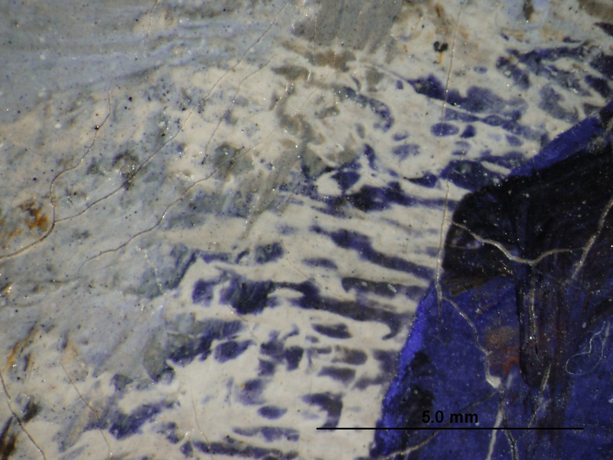 Photomicrograph of Monet’s The Beach at Sainte-Adresse (1867) showing where the artist wiped away wet blue paint. The Art Institute of Chicago, 1933.439.