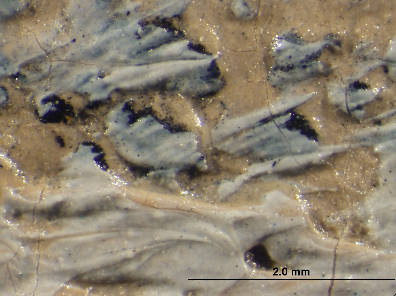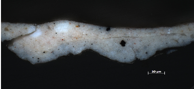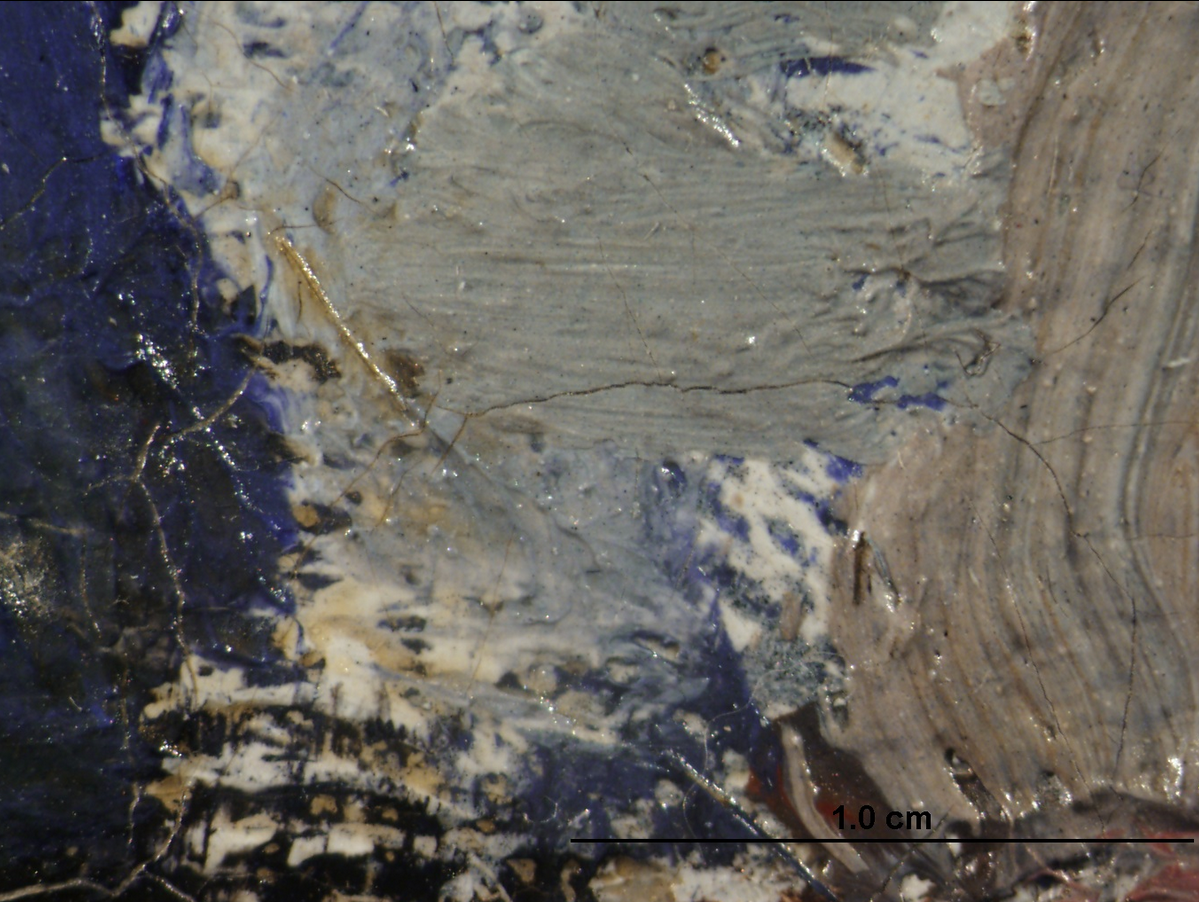 Observing the painting microscopically, only the upper ground layer is visible. It has a warm pinkish-beige tone, which can be seen in small areas throughout the painting at breaks in the brushwork (fig. 13.16). [glossary:Cross-sectional analysis] shows another layer below the pinkish-beige one that is light gray in color (fig. 13.17).