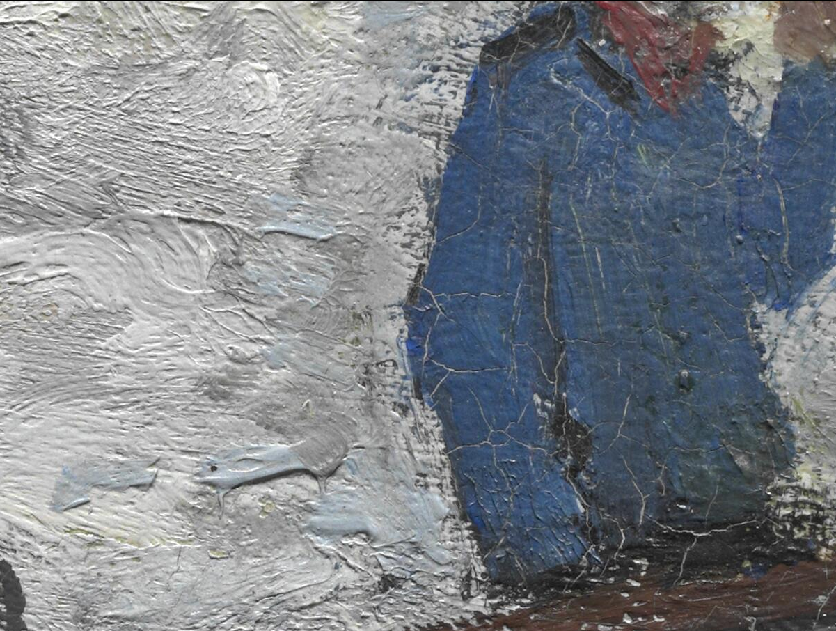 Detail of Monet’s The Beach at Sainte-Adresse (1867) showing blue paint visible through the final touches added at the edge of the figure’s jacket. The Art Institute of Chicago, 1933.439.