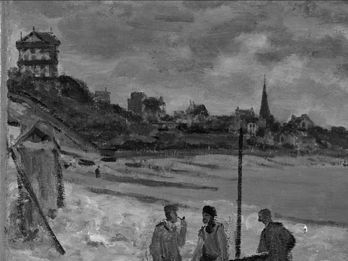 Infrared reflectogram (Surface Optics, 1646 nm) detail of Monet’s The Beach at Sainte-Adresse (1867) showing figures from an earlier composition. The Art Institute of Chicago, 1933.439.