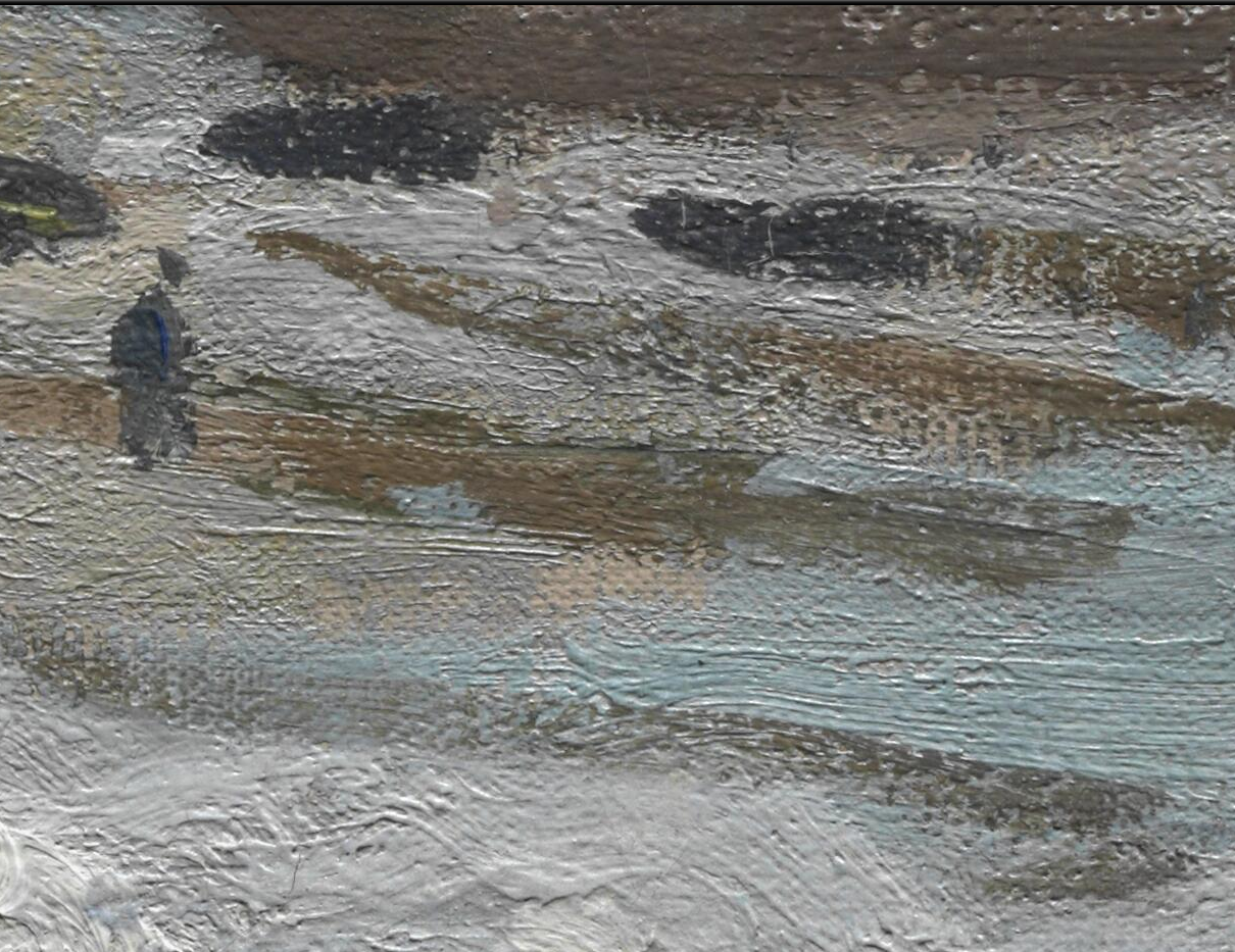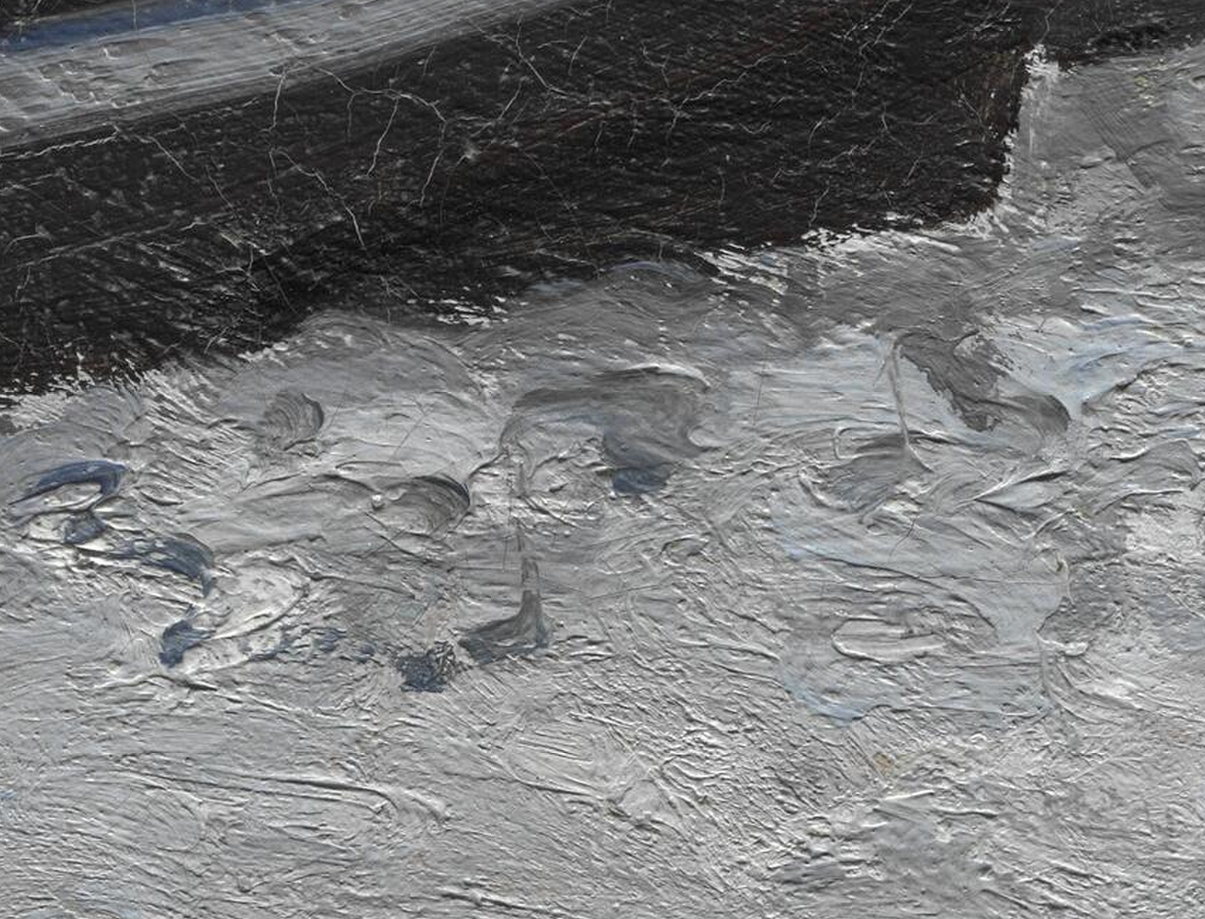 Other, more minor changes include the position and size of the three central boats on the shore. In the X-ray, the front boat appears smaller and is positioned at more of an angle, while the front end of the middle boat was originally slightly shorter (fig. 13.33). The farthest boat appears to have been a later addition, since the beach underneath it is more worked up than in the area of the other two boats. Some modifications are also visible in the buildings on the left side of the composition (fig. 13.34). For example, the large building at the top of the hill was originally in a lower position. To the immediate right, the two brownish-gray buildings, as well as the large house to the right of the spire, appear to have been added at a later stage, as they were painted over the sky, in contrast to the other buildings, which were incorporated into the composition from an early stage, with the sky built up around them. A slight adjustment may also have been made to the spire. The boats and the three fishermen on the left side of the work were all painted on top of the beach, indicating that they were later additions to the painting (fig. 13.35). Brushstrokes related to the beach continue underneath the figures (fig. 13.36). Changes to the figures seem to have involved either minor shifts in position or modifications in size. This is particularly evident around the blue jacket of the left fisherman and the center figure’s left shoulder (fig. 13.37). Around the blue jacket, it is clear that the artist wiped away some of the still-wet blue paint, leaving traces in the recesses of the underlying paint of the beach (fig. 13.38). It seems that the off-white paint of the beach was still soft when the blue paint was wiped away, as the peaks of the brushmarks appear smooth and flattened in the wiped areas. The artist then applied a few strokes of grayish paint, presumably to cover these paint residues (fig. 13.39 and fig. 13.40); this was not done precisely, however, and the paint residues remain clearly visible in places. The shoreline behind the fishermen seems to have been adjusted slightly, the pale-gray paint of the beach having been extended farther into the water (fig. 13.41). The erosion-prevention structures, placed at intervals perpendicular to the distant shore, were originally longer, perhaps suggesting a change in the water level (fig. 13.42).