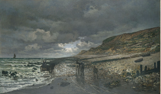 The Beach at Sainte-Adresse was executed in the summer of 1867, an extraordinarily challenging time for Monet personally. Earlier in the year, upon learning that his companion, Camille Doncieux, was pregnant, Monet had moved into his aunt’s home in Sainte-Adresse. In order to shield his disapproving family from the situation, he discreetly shuttled back and forth to Paris, where he had arranged for Camille to be cared for. Despite (or perhaps because of) his complicated personal life, Monet was productive during this period: by the end of June, he wrote from Sainte-Adresse to the painter Frédéric Bazille that he had “twenty or so canvases well under way, stunning seacapes, figures, and gardens, something of everything in fact.”11 It was not the first time Monet had painted the coast of Normandy, or specifically Sainte-Adresse, however. Just two years earlier, he had made his debut at the 1865 Paris Salon with two large, ambitious seascapes of the region—the Kimbell Art Museum’s La Pointe de la Hève at Low Tide (fig. 13.4 [W52]), a picture depicting the Sainte-Adresse beach looking northward; and the Norton Simon Museum’s Mouth of the Seine at Honfleur (fig. 13.5 [W51]), which portrays Honfleur, situated at the mouth of the Seine across from Le Havre.12 These two works—largely praised by Salon critics—were painted in Monet’s studio and based on smaller oil studies on canvas that he had previously made on location.13 Notably, in the Salon compositions as well as other paintings he made around this time, the artist downplayed the ongoing resort development in Normandy. With their rather muted, gray-and-brown-infused palettes, Monet’s early seascapes predominantly depict brooding natural environments and feature Normandy’s beaches and terrain as the workplaces of its local inhabitants and fishermen.14