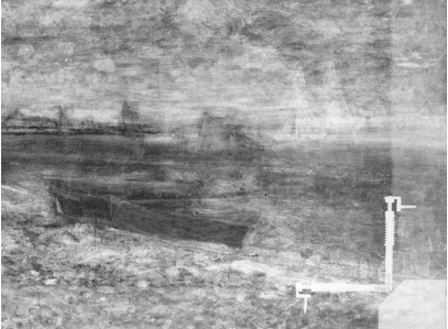 Infrared reflectogram (Surface Optics, 1646 nm) detail of Monet’s The Beach at Sainte-Adresse (1867) showing boats in an earlier composition. The Art Institute of Chicago, 1933.439.