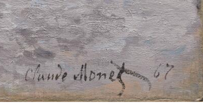 Signed and dated: Claude Monet 67 (lower right, name in dark-brown paint,24 year in reddish-purple paint25) (fig. 13.12 and fig. 13.13).26 The signature and date were applied when the underlying paint was dry. The different colors of paint used for these two elements may indicate that they were added at different times.