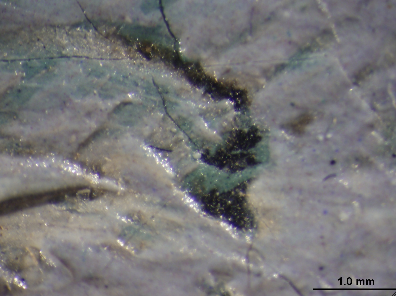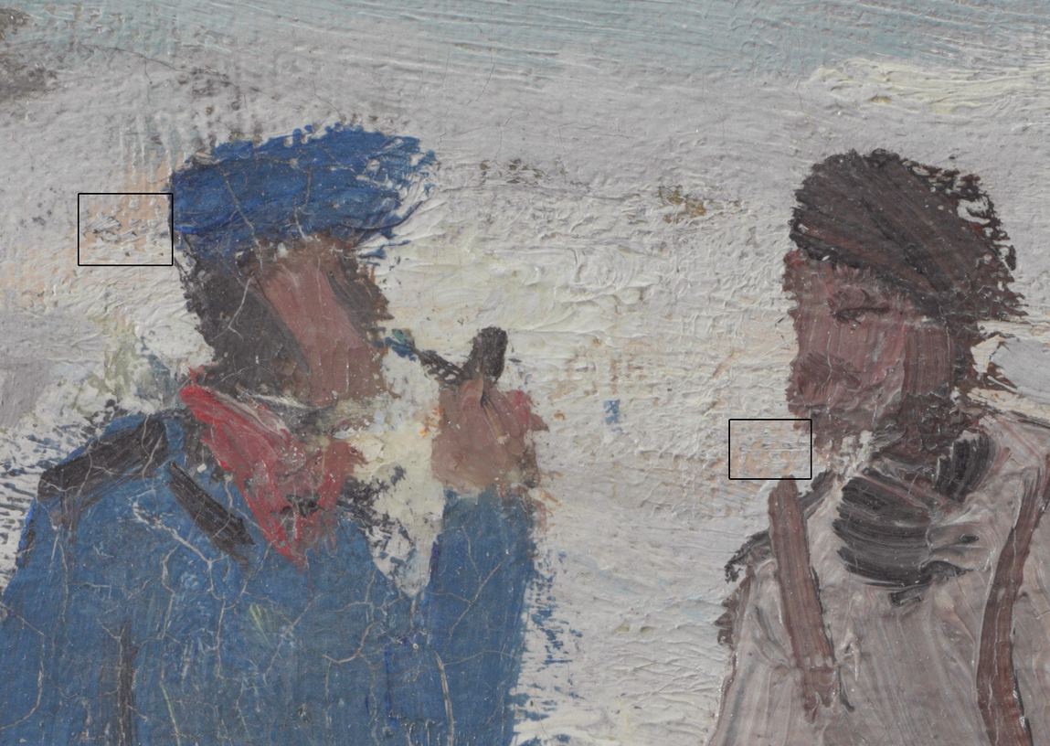No [glossary:underdrawing] was detected with [glossary:infrared reflectography] (IRR); however, some black particulate material was observed microscopically in a few localized areas. To the left of the heads of the left and middle fishermen, there are a few concentrated areas of black particles deposited on the high points of the primed canvas between the ground and paint layers (fig. 13.18 and fig. 13.19). At the extreme left edge, directly above the boats, are three short lines at varying angles (fig. 13.20), where the black particles appear to be on top of or incorporated into the paint layer (fig. 13.21).32