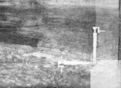 Infrared reflectogram (Surface Optics, 1646 nm) detail of smokestacks in Monet’s The Beach at Sainte-Adresse (1867). The Art Institute of Chicago, 1933.439.