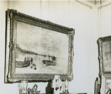 Monet’s The Beach at Sainte-Adresse (1867) in a previous frame, on display in Mrs. Lewis Larned (Annie Swan) Coburn’s Blackstone Hotel apartment. Institutional Archives, Art Institute of Chicago.