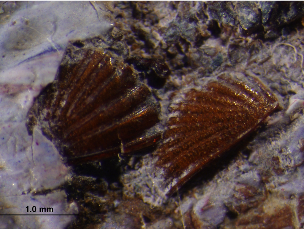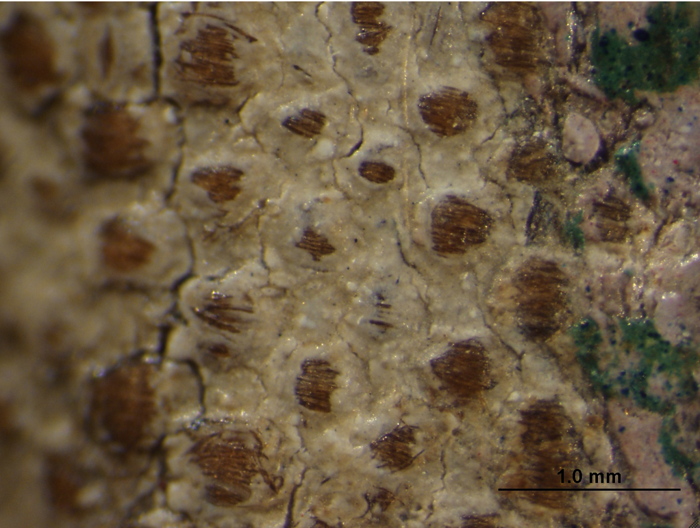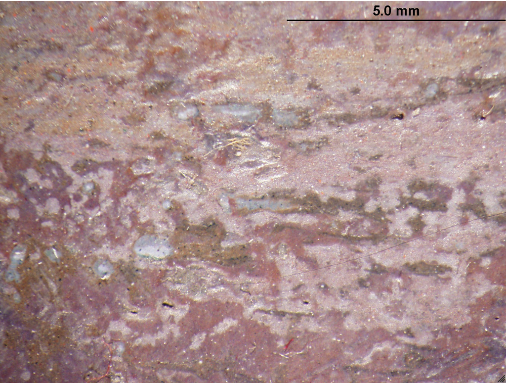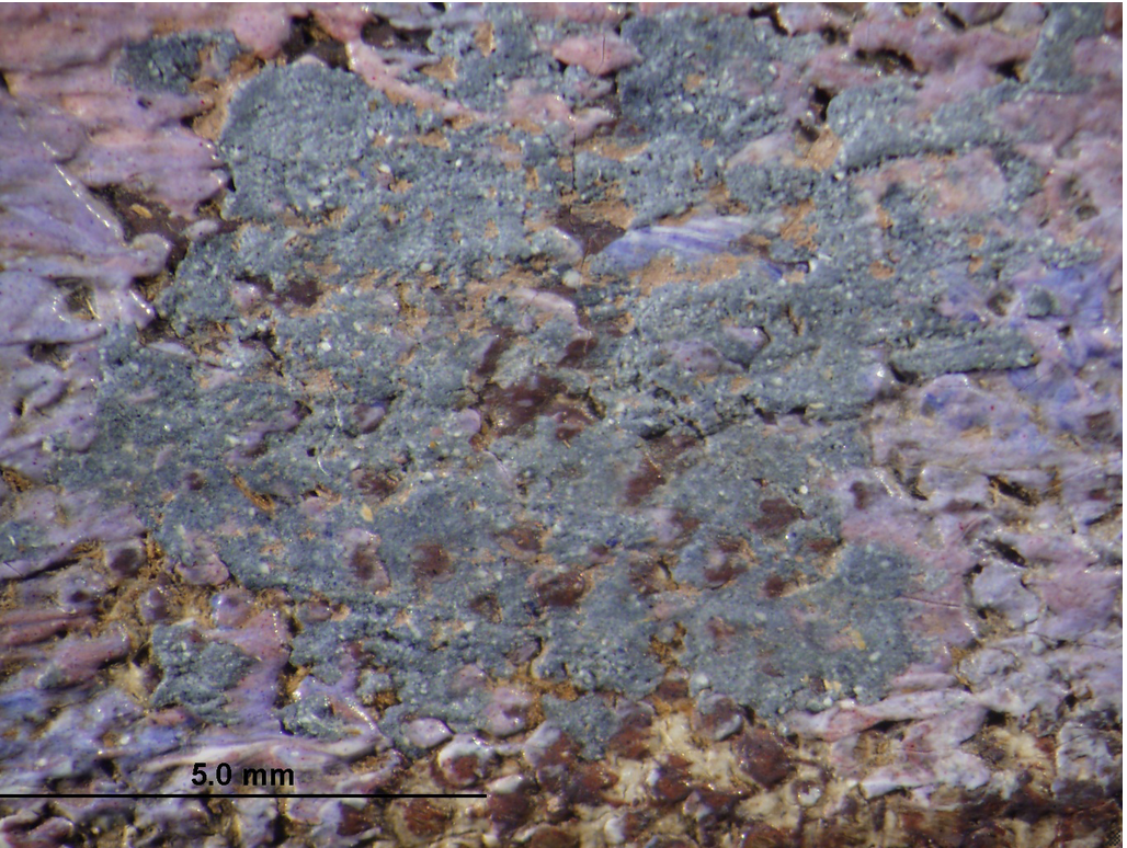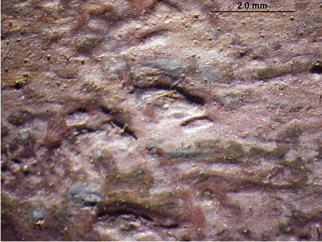 Sample and [glossary:cross-sectional analysis] using a Zeiss Axioplan 2 research microscope equipped with reflected light/UV fluorescence and a Zeiss AxioCam MRc5 digital camera. Types of illumination used: [glossary:darkfield], differential interference contrast ([glossary:DIC]), and [glossary:UV]. In situ photomicrographs with a Wild Heerbrugg M7A StereoZoom microscope fitted with an Olympus DP71 microscope digital camera.