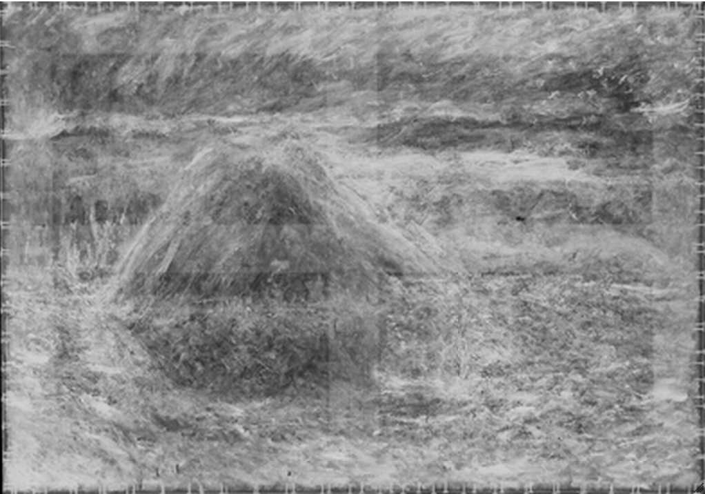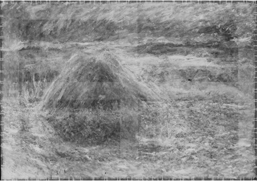 X-ray of Monet’s Stack of Wheat (Thaw, Sunset) (1890/91) showing the dense buildup of the paint layer. The Art Institute of Chicago, 1983.166. X-ray digitally composited by Robert G. Erdmann, University of Arizona.