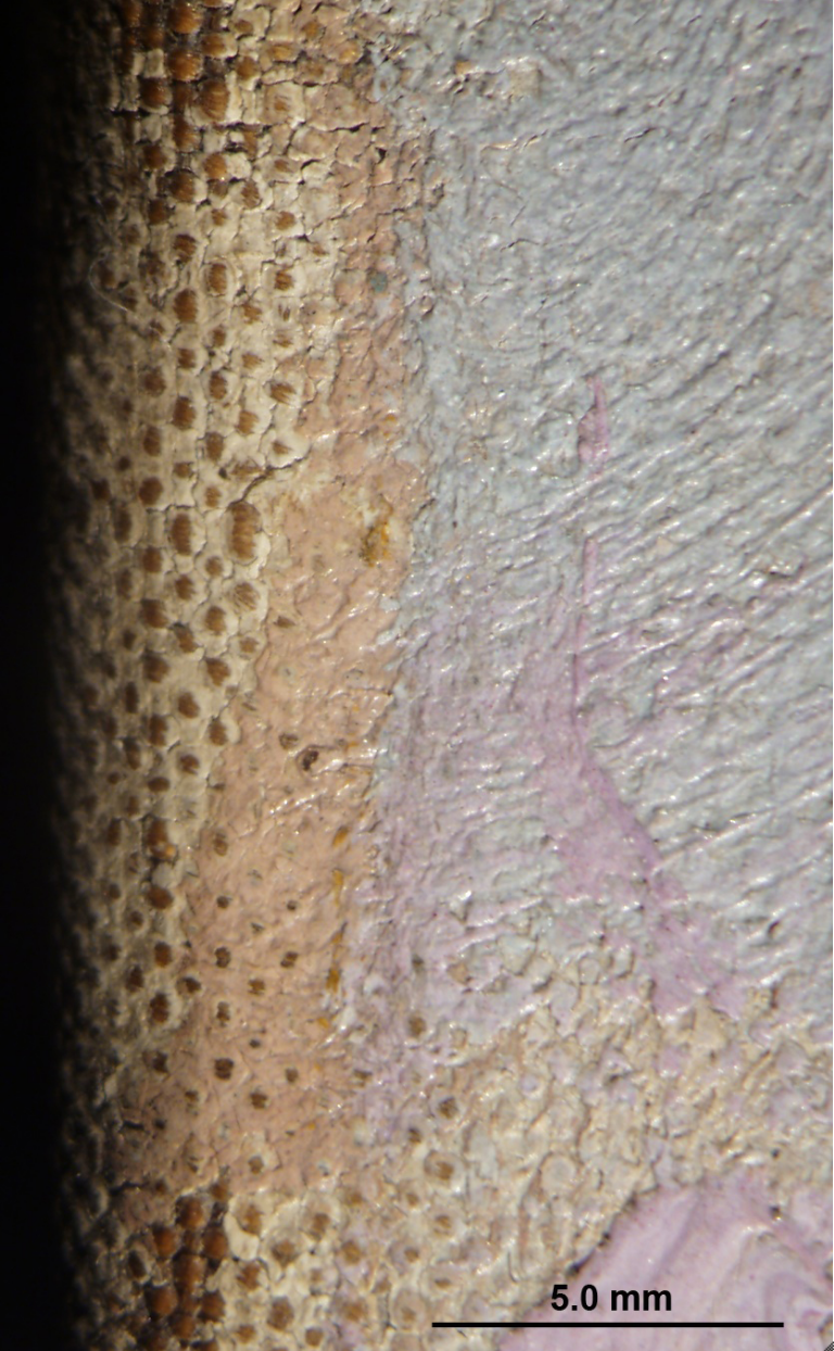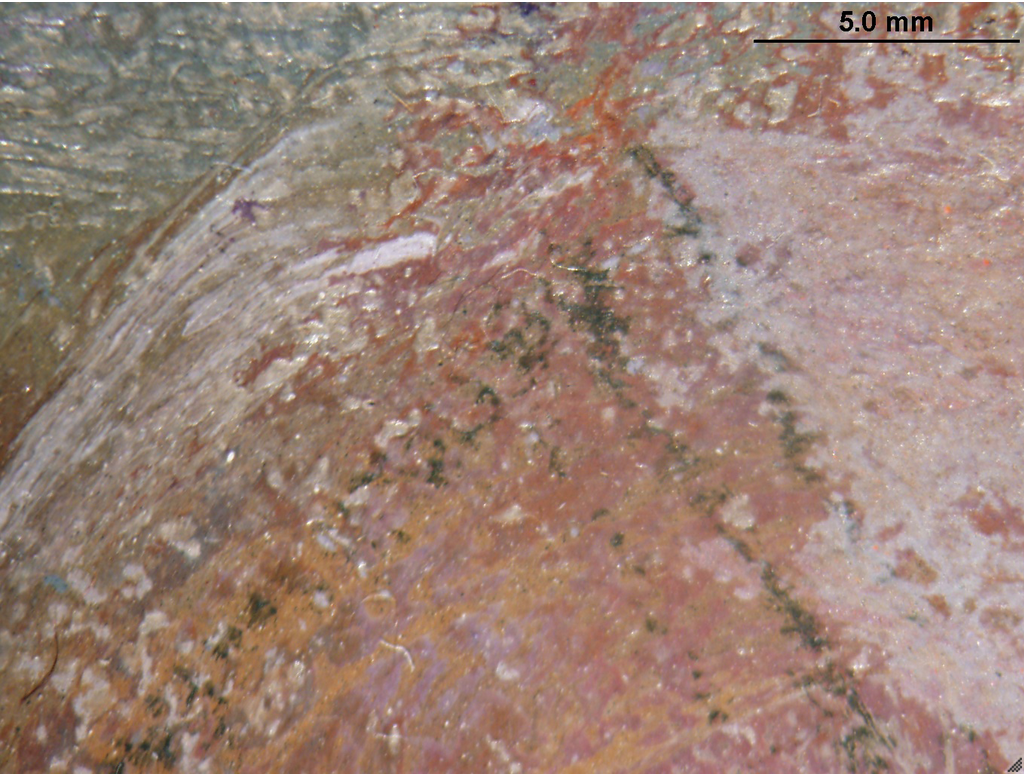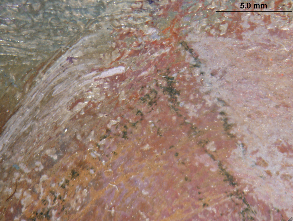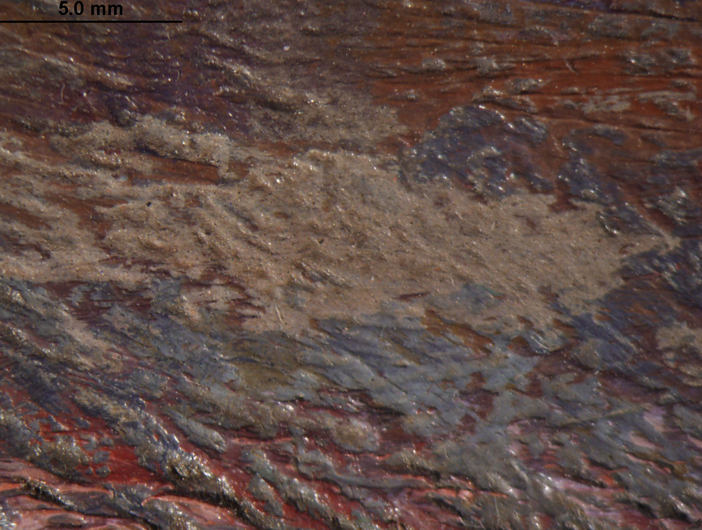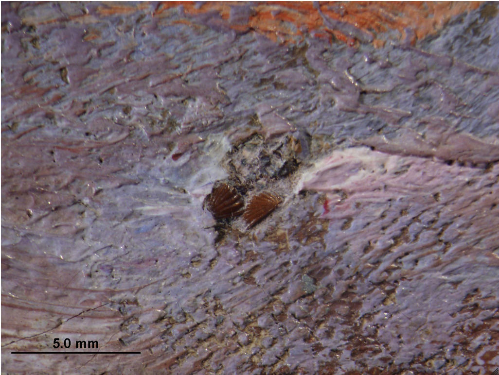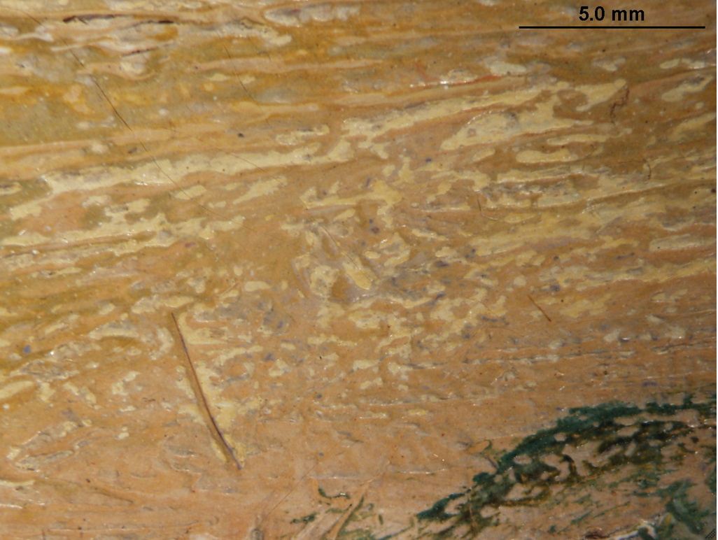 It seems that the artist rubbed or scraped over areas of the painting when the upper paint layers were set up but still relatively soft, leading to tiny areas of abrasion and interlayer cleavage that expose the lower layers at the surface of the painting (fig. 15.38). There is a band of short, vertical marks in the paint, near the top edge, approximately 1 cm wide, which occurred when the paint was still wet. This could be the result of contact from an easel cleat or some kind of transporting device. In some areas, final strokes from the sky pass over these marks (fig. 15.39), indicating that they occurred while the artist was still working on the painting. Several light gouges were observed throughout the paint surface. These probably occurred as a result of handling when the paint was still soft. There are several brush hairs embedded in the paint surface, as well as tiny bubble holes where the paint was more thickly applied or more heavily worked. Two unidentified inclusions in the paint layer were observed near the bottom right edge (fig. 15.40, fig. 15.41). These ridged, reddish-brown, shell-shaped objects measure approximately 2 mm in diameter and are probably composed of organic material (they appear relatively radio transparent in the X-ray). They could be plant-related materials that were incorporated into the paint layer when it was wet. There is some flattened impasto around the edges of the painting, presumably due to framing while the paint was still soft.