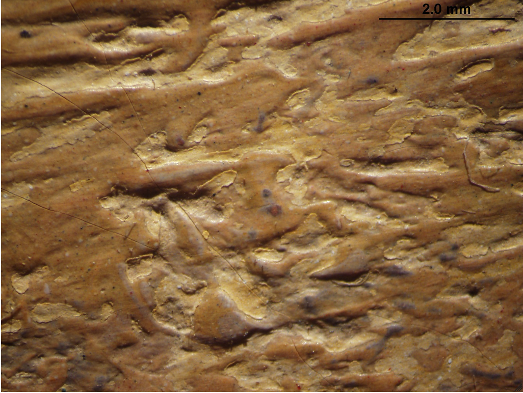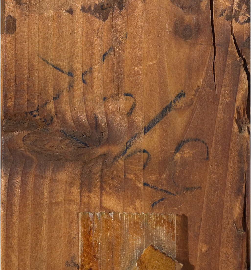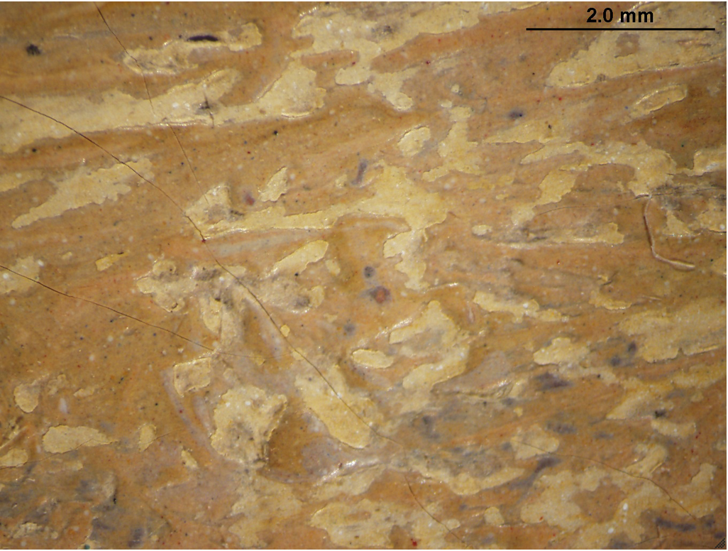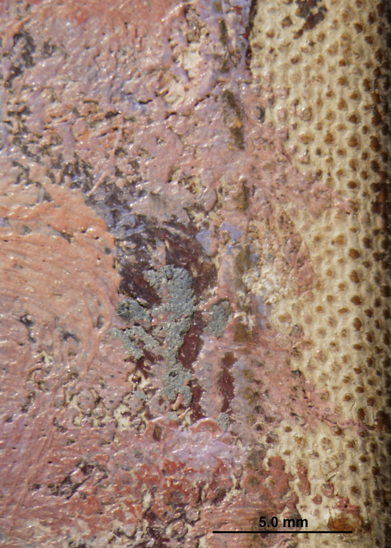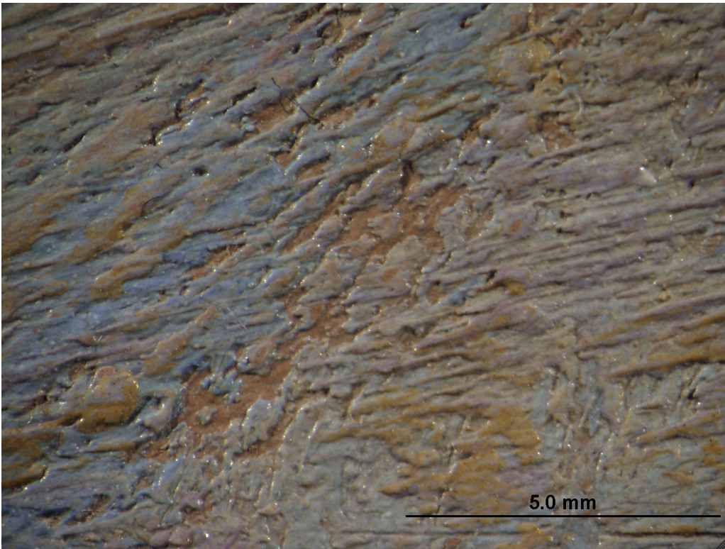 It seems that the artist rubbed or scraped over areas of the painting when the upper paint layers were set up but still relatively soft, leading to tiny areas of abrasion and interlayer cleavage that expose the lower layers at the surface of the painting (fig. 15.38). There is a band of short, vertical marks in the paint, near the top edge, approximately 1 cm wide, which occurred when the paint was still wet. This could be the result of contact from an easel cleat or some kind of transporting device. In some areas, final strokes from the sky pass over these marks (fig. 15.39), indicating that they occurred while the artist was still working on the painting. Several light gouges were observed throughout the paint surface. These probably occurred as a result of handling when the paint was still soft. There are several brush hairs embedded in the paint surface, as well as tiny bubble holes where the paint was more thickly applied or more heavily worked. Two unidentified inclusions in the paint layer were observed near the bottom right edge (fig. 15.40, fig. 15.41). These ridged, reddish-brown, shell-shaped objects measure approximately 2 mm in diameter and are probably composed of organic material (they appear relatively radio transparent in the X-ray). They could be plant-related materials that were incorporated into the paint layer when it was wet. There is some flattened impasto around the edges of the painting, presumably due to framing while the paint was still soft.