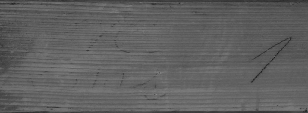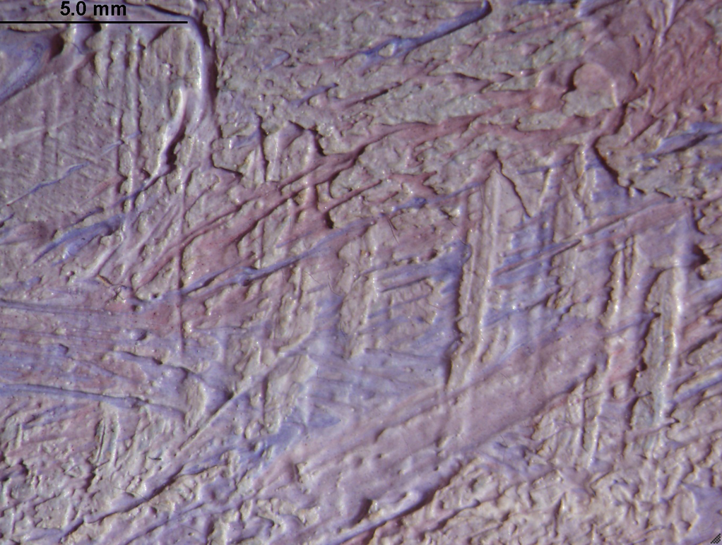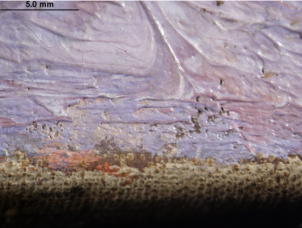 Photomicrograph of the top edge of Monet’s Stack of Wheat (Thaw, Sunset) (1890/91) showing vertical marks that were made when the paint was still soft. The Art Institute of Chicago, 1983.166.