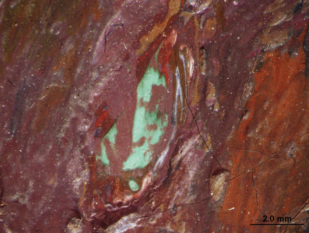 Photomicrograph of a building in Monet’s Stack of Wheat (Thaw, Sunset) (1890/91) showing a bright-green underlayer. The Art Institute of Chicago, 1983.166.