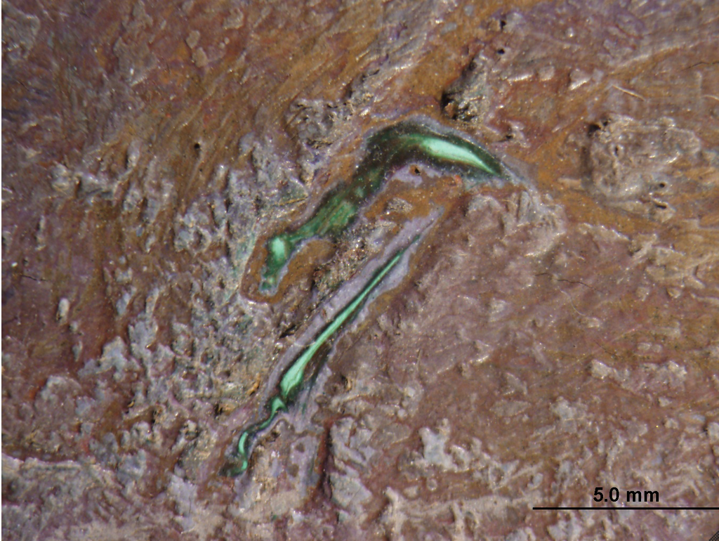Photomicrograph of the wheat stack in Monet’s Stack of Wheat (Thaw, Sunset) (1890/91) showing a bright-green underlayer. The Art Institute of Chicago, 1983.166.