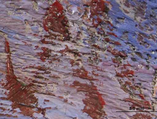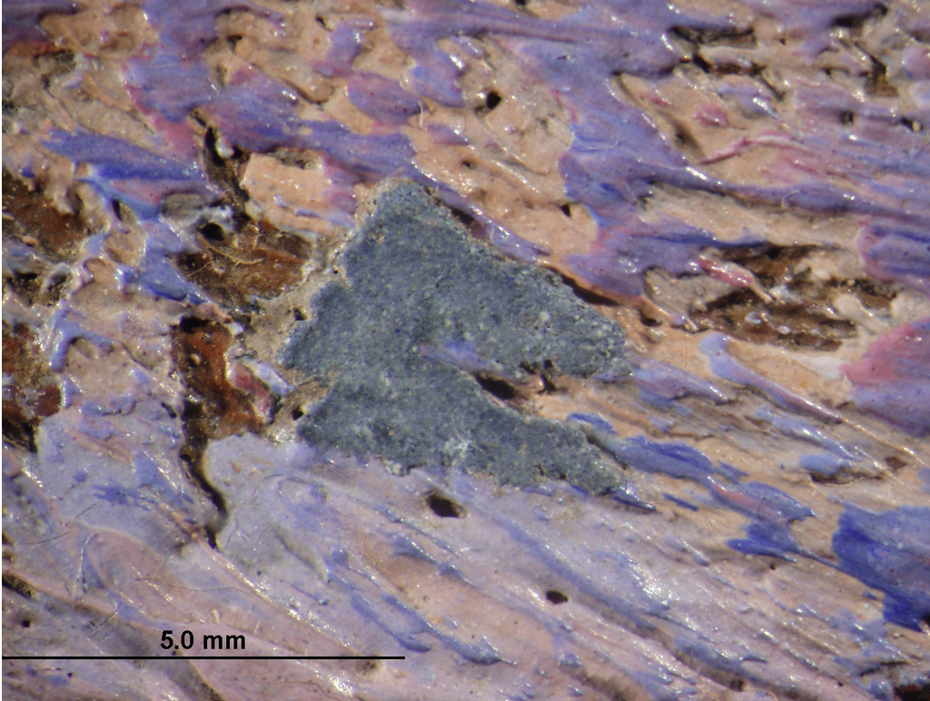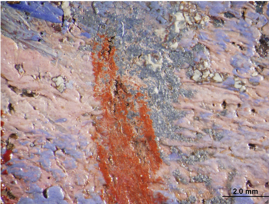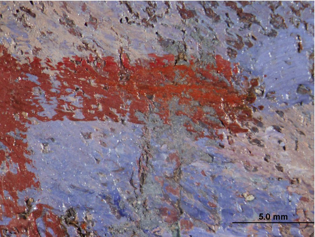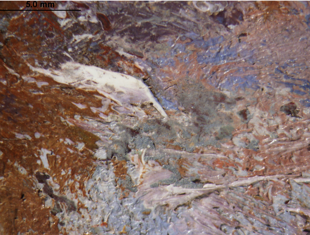 Photomicrograph of the sky in Monet’s Stack of Wheat (Thaw, Sunset) (1890/91) showing traces of old retouching. The Art Institute of Chicago, 1983.166.
