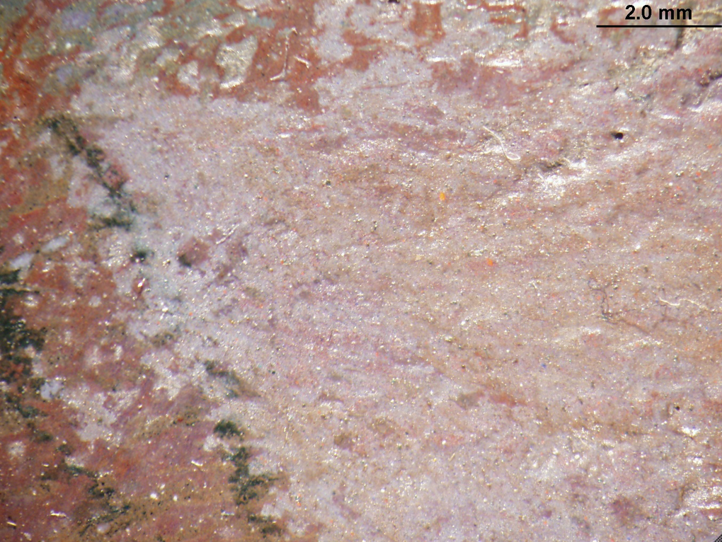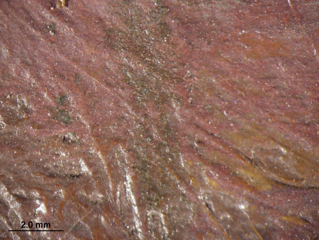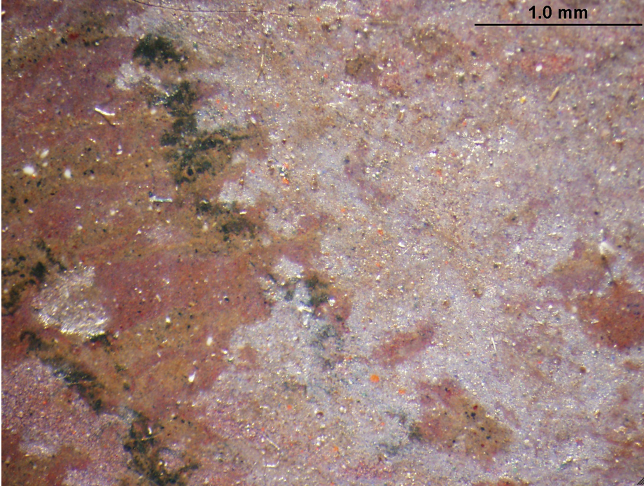 Photomicrograph of the field in Monet’s Stack of Wheat (Thaw, Sunset) (1890/91) showing a greenish-gray underlayer. The Art Institute of Chicago, 1983.166.