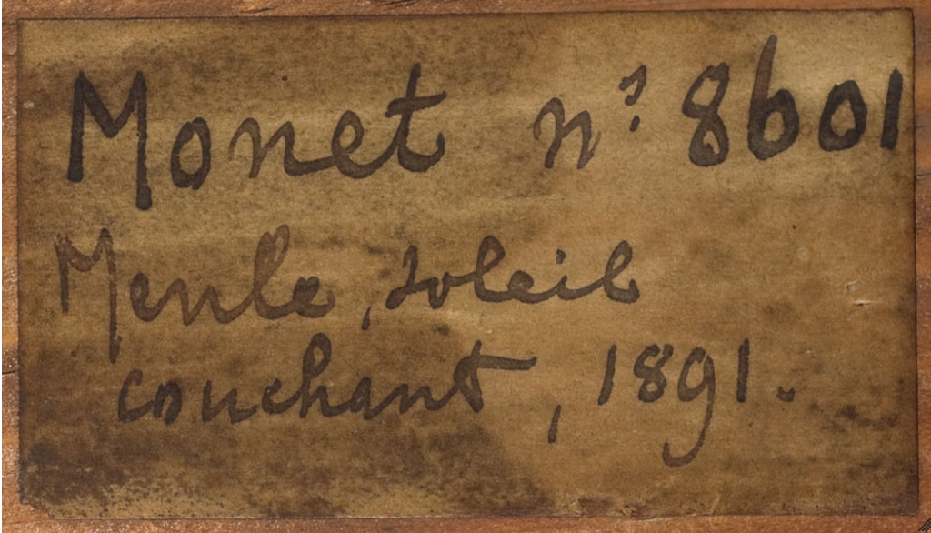 Detail of Monet’s Stack of Wheat (Thaw, Sunset) (1890/91) showing the signature. The Art Institute of Chicago, 1983.166.
