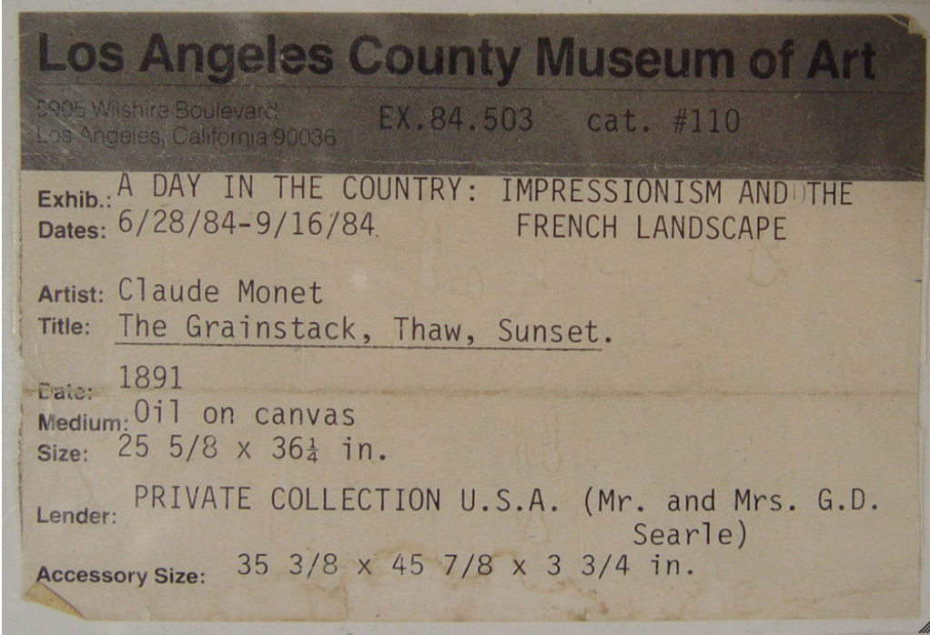 Content: Los Angeles County Museum of Art / 5905 Wilshire Boulevard / Los Angeles, California 90036 / EX.84.503 cat. #110 / Exhib.: A DAY IN THE COUNTRY: IMPRESSIONISM AND THE / FRENCH LANDSCAPE / Dates: 6/28/84–9/16/84 / Artist: Claude Monet / Title: The Grainstack, Thaw, Sunset. / Date: 1891 / Medium: Oil on canvas / Size: 25 5/8 × 36 1/4 in. / Lender: PRIVATE COLLECTION U.S.A. (Mr. and Mrs. G.D. / Searle) / Accessory Size: 35 3/8 × 45 7/8 × 3 3/4 in. (fig. 15.22)
