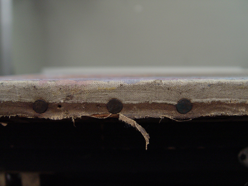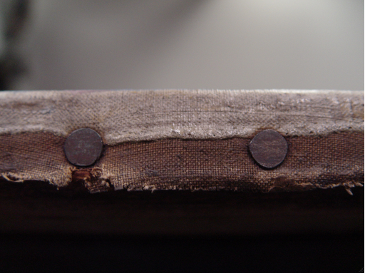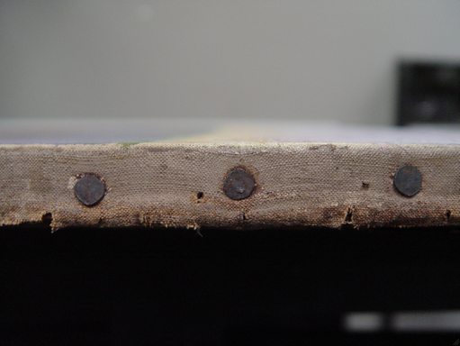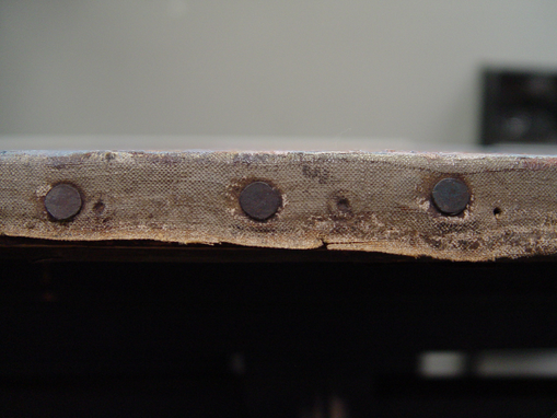 Current stretching: Dates to preacquisition [glossary:lining] (see Conservation History); tacks spaced 2.5–5 cm apart. Most of the original tack holes were reused when the canvas was restretched after lining, with additional tacks added in between (fig. 3). Along the left edge, there are seven old tack holes that do not correspond to the cusping. There are a few old tack holes, located at or close to the canvas edges (some torn or cut through), mainly seen on the right edge (fig. 5). Some additional pinholes, which pass through the canvas and into the [glossary:stretcher], appear to be more recent. A separate set of tacks (underneath the original [glossary:tacking margins]) attaches the [glossary:lining] canvas tacking edges to the stretcher (i.e., the [glossary:tacking edges] were separated after lining and tacked down separately). The lining canvas tacks are visible in the [glossary:X-ray], and the impression of the tack head is visible through the original tacking edge in places. The edges of the canvas sometimes turn over the back edge of the stretcher. Based on marks impressed in the canvas in a few places, it appears that canvas pliers were used to stretch the canvas at some point.