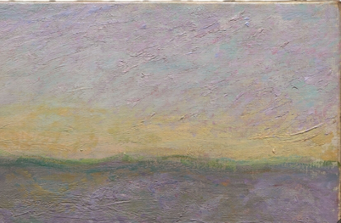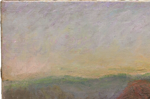 In the execution of the final painting, the artist worked up the surface as a whole, using an open network of overlapping brushstrokes. The sky was laid in with a warm underlayer, which ranges in tone across the surface from pale orange-brown to off-white (fig. 12.13). Over this, more textural strokes of pale blue, green, pink, and yellow paint were applied, leaving both the [glossary:underpainting] and the ground layer visible in places, especially near the edges where the brushwork is more open (fig. 15.30). This underlayer does not always extend to the edges of the canvas; microscopically, it appears discontinuous in places, leaving the ground layer visible and suggesting that it was somewhat sketchy and open. The underpainting appears to have been dry when the sky was built up and the upper paint layers include both wet-in-wet and wet-over-dry paint application, indicating that the sky was carried out in more than one session. The yellow area, near the horizon, was built up with thicker strokes of paint. This was still wet in a few places when some of the strokes of green paint from the hilltops were dragged through it. In the foreground, the artist worked from dark to light, laying in the area beneath the field with dark reddish-brown (fig. 17.71, fig. 15.32), dark purple, and dull greenish-gray tones (fig. 17.72).834 The upper pink, peach, and blue strokes of the field were applied in both wet-in-wet and wet-over-dry layering. Final strokes of warm orange-red and yellow tones were lightly dragged across the surface, such that the brushstrokes skip over the recesses of the underlying dry paint and accentuate its surface texture (fig. 15.34). The wheat stack and the hills and buildings behind consist of fairly continuous paint applications, making it difficult to see the underlying layers. An isolated stroke of bright emerald green [glossary:impasto], near the upper-left edge of the stack and which is just exposed at the surface, suggests that some brighter, more colorful tones were used in the earlier stages of building up this area (fig. 15.35). Another small area of bright green paint from an underlying layer is visible in the area of the building farthest to the right (fig. 15.36, fig. 15.33). The buildings in this area were articulated by just a few broad brushstrokes; the only architectural detail being the very fine lines of dark green paint used to delineate the eaves of the building at far right and the pale gray highlight on the edge of its roof (fig. 15.33, fig. 15.37).